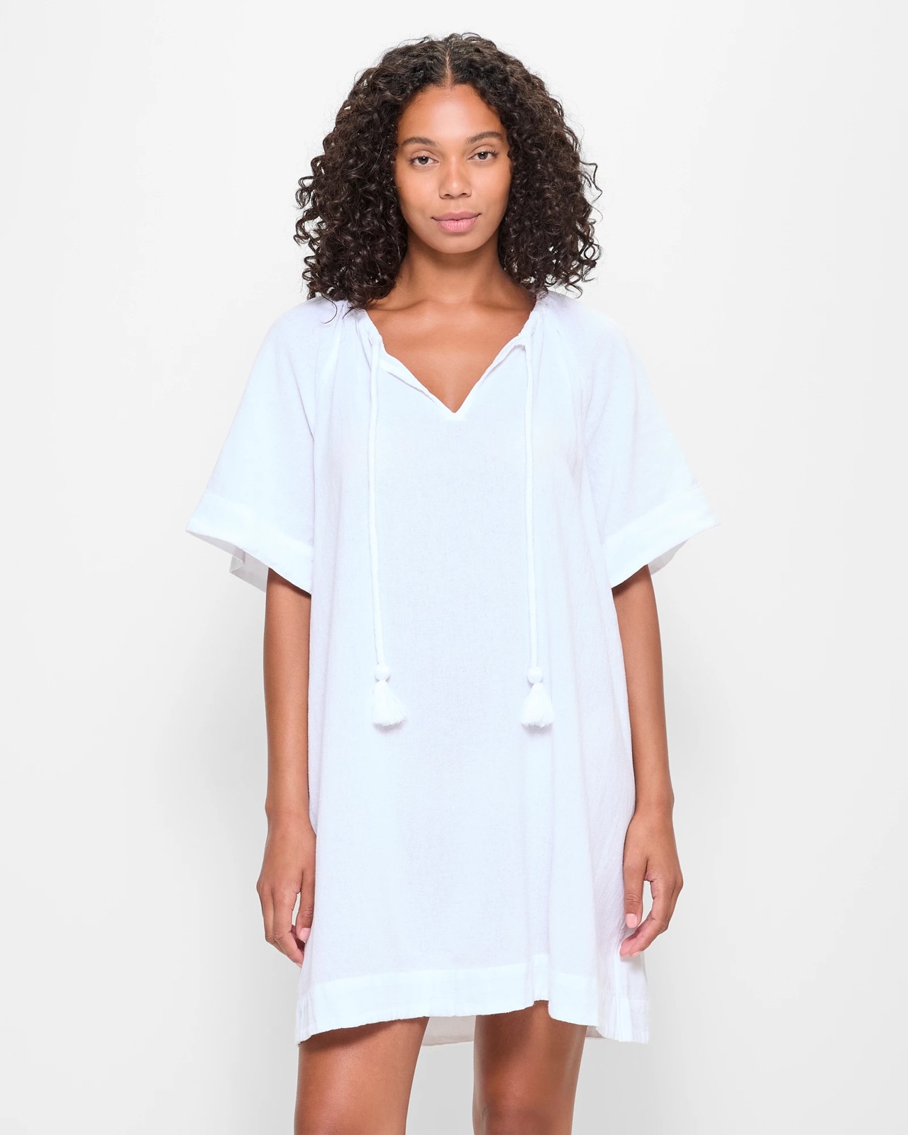 Discover the comfort and style of our Rope Tie Detail Dress. Made from soft cotton, this dress is light and perfect for those warm days. The textured fabric and relaxed fit add a touch of charm, making it versatile for both casual outings and beach coverups. The round neckline with a charming rope tie and keyhole detail, combined with short sleeves and a straight hemline, offers a lovely look. Step out in confidence and perfect your everyday ensemble with this must-have addition to your wardrobe. Grab your size today and experience the blend of comfort and style.