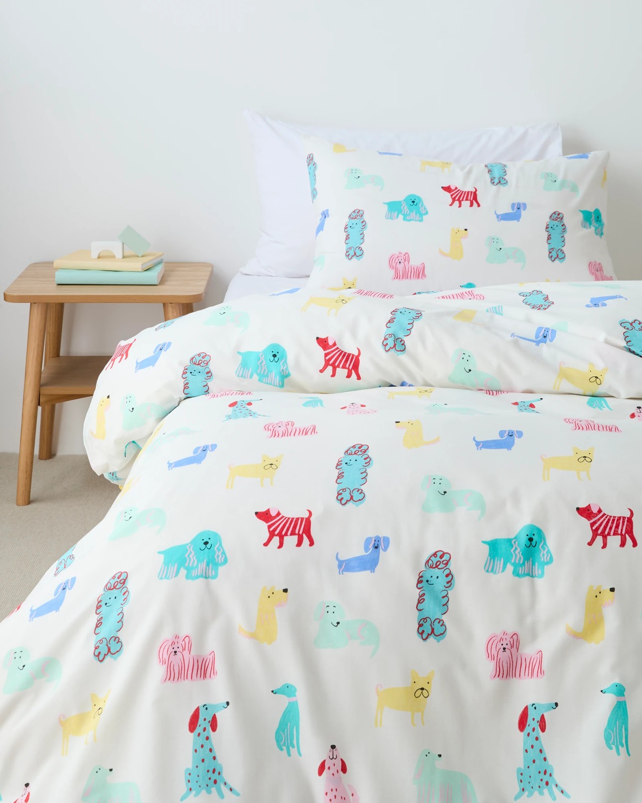 Transform your child's bedroom into a playful and enchanting area with the Rover Dogs Quilt Cover Set. This delightful quilt cover set is made from cotton polyester blend, for a cosy and comfortable rest for your little one. The vibrant Rover Dogs print will ignite their imagination and create an exciting atmosphere in the room. The design features a colourful dog print on white background. Upgrade your child's bedding collection and bring the wonders of the best friend into their sleep space with the Rover Dogs Quilt Cover Set.