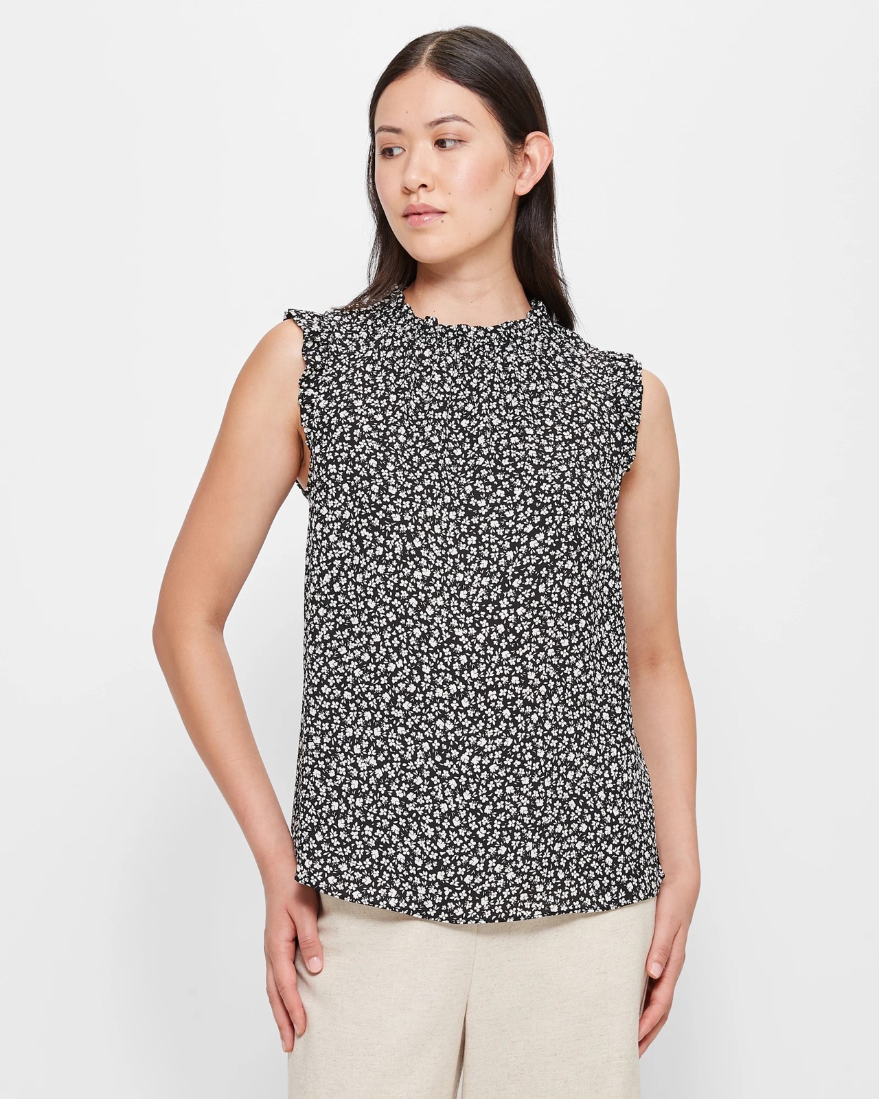 Look smart around the town in our Preview ruffle neck tank top. Perfect for pairing with work pants and a blazer for classic styling for the office or your favourite jeans and heels for some time out, the tank features a round neckline with upper frill and a classy back button closure, short flutter sleeves and a curved hemline to flatter your shape.