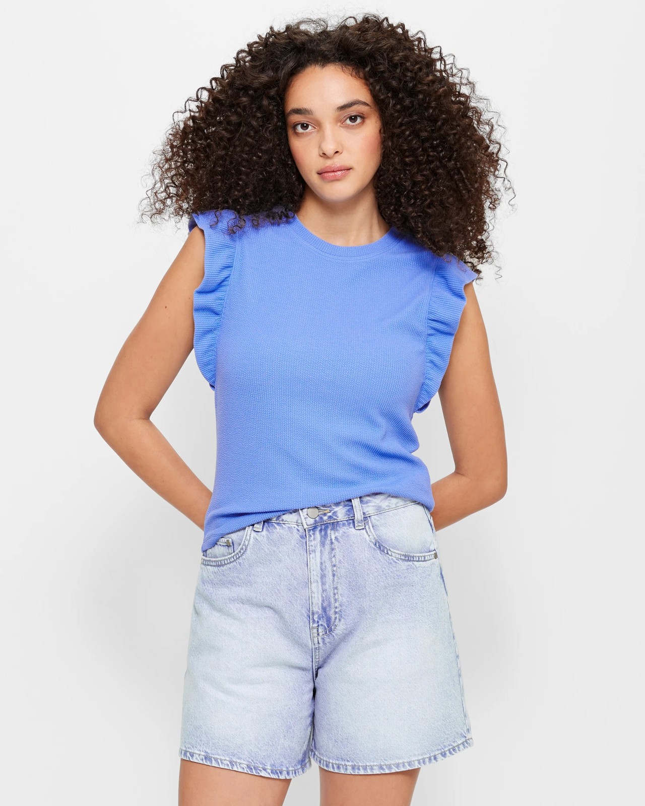 An all over textured design and a great coverup, the ruffle sleeve top features a round neckline, short ruffle sleeves and a straight hemline. Great to dress up or down all summer season long!