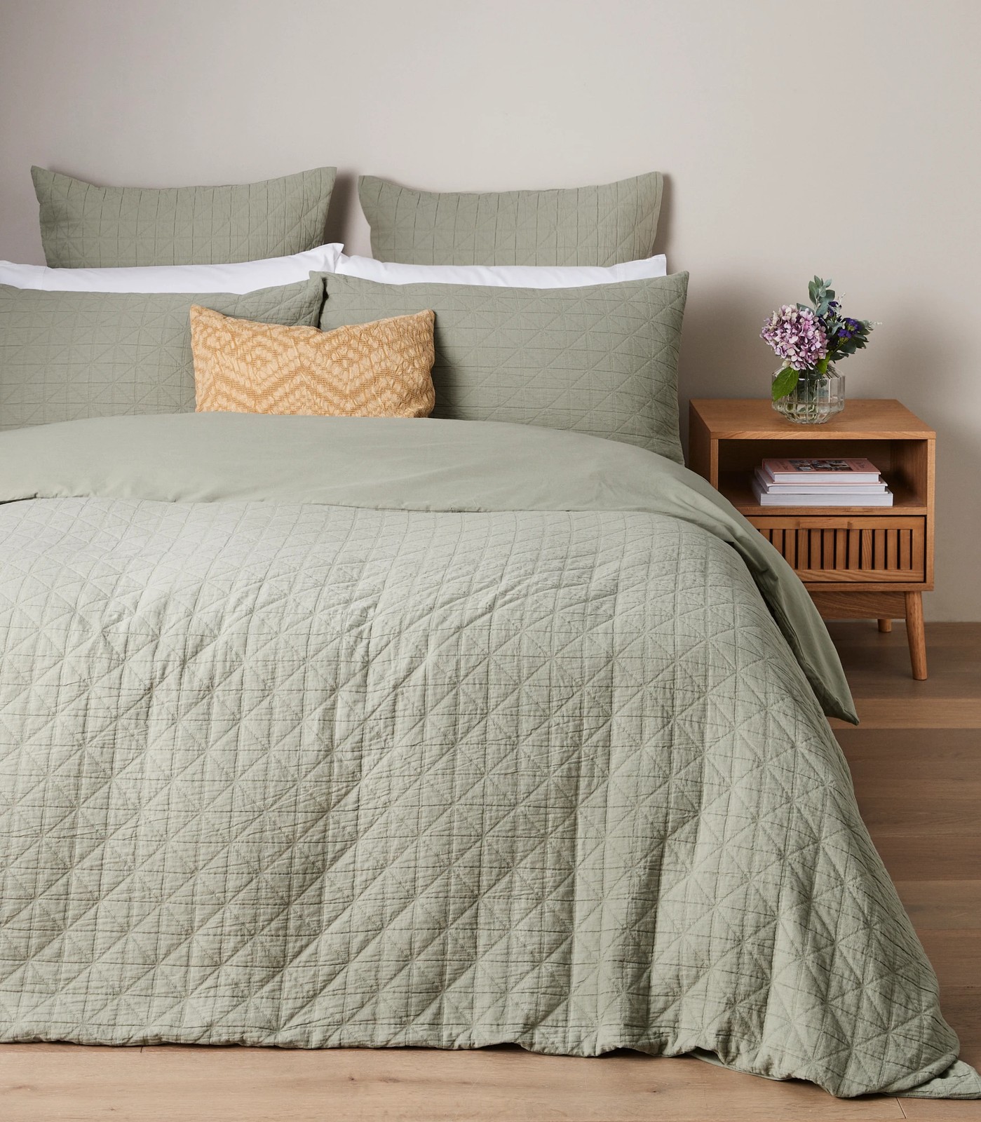 Step up your bedroom style with the Rylan Geo Matelasse Quilt Cover Set. This elegant set is crafted from soft stonewashed cotton and features a modern geo pattern in a soothing sage green hue. The matelasse texture adds an extra layer of comfort, making this quilt cover perfect for snuggling up in on cosy nights. Whether you’re decorating your master bedroom or transforming a guest room, this timeless design will bring beauty and charm to any space.