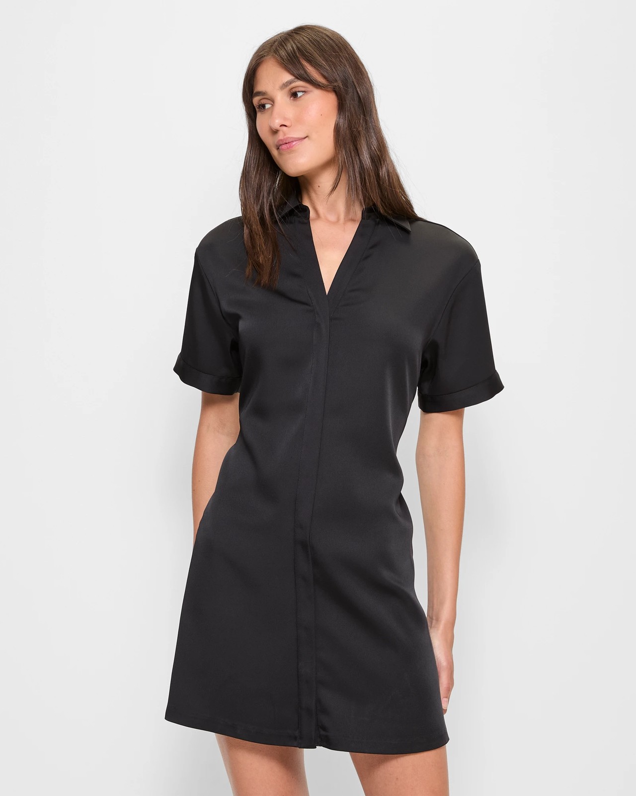 Experience unmatched style with this Satin Tie Waist Mini Shirt Dress. Made from fine polyester, this dress has a soft satin touch that drapes beautifully. The chic black colour and refined design, featuring a round collared neckline and a v-front, exude sophistication. The removable tie waist belt perfectly accentuates your shape, while the short cuffed sleeves and hidden button-through front add a touch of modern flair. Ideal for any event, whether it’s day or night, this dress is the ultimate addition to your wardrobe. Don't let this versatile piece slip away - make it yours today!