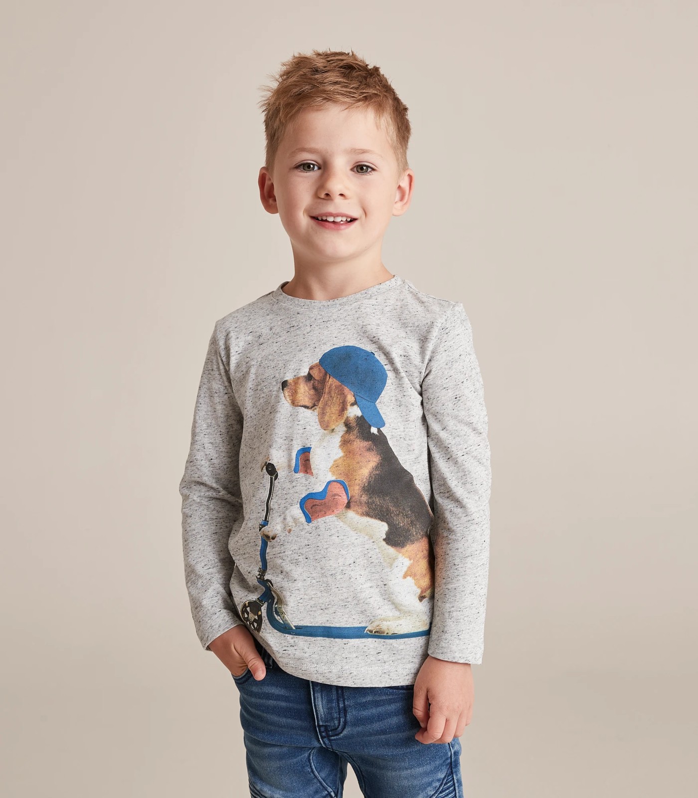 In an all over speckle, the grey marle Scooting Beagle T-shirt features a crew neck, long sleeves and a graphic scooting Beagle dog print on the front.