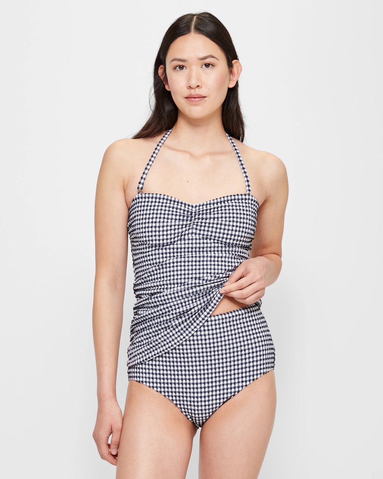 Experience the ultimate in body shaping and comfort with our seersucker halter tankini top. Crafted from a soft nylon rich fabrication and designed with recycled materials, this top is perfect for your next beach day or pool party. The power net lining is designed to slim and shape your body, while the ruched front, halter straps and removable padded cups provide extra coverage and support. Get ready to look and feel your best with our stylish tankini top! Pair with the matching gingham swim bottoms to complete your on-trend look at the beach this summer (sold separately)!