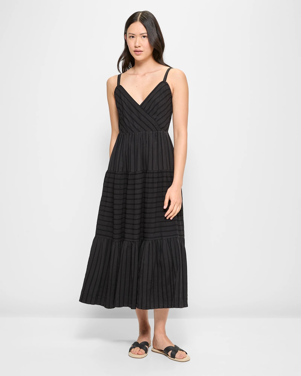 Step into comfort with our Seersucker Maxi Dress, made from a luxurious blend of viscose and cotton. Ideal for warm days, it features a charming V-neckline and thin, adjustable straps for the perfect fit. The cross over chest design and structured underbust lend a touch of class, while the gathering and wide panels from bust to hem ensure a graceful look. With its maxi length and straight hemline, this dress is perfect for both casual and special occasions. The centre back shirred panel offers ease of wear, making it a versatile addition to any wardrobe.