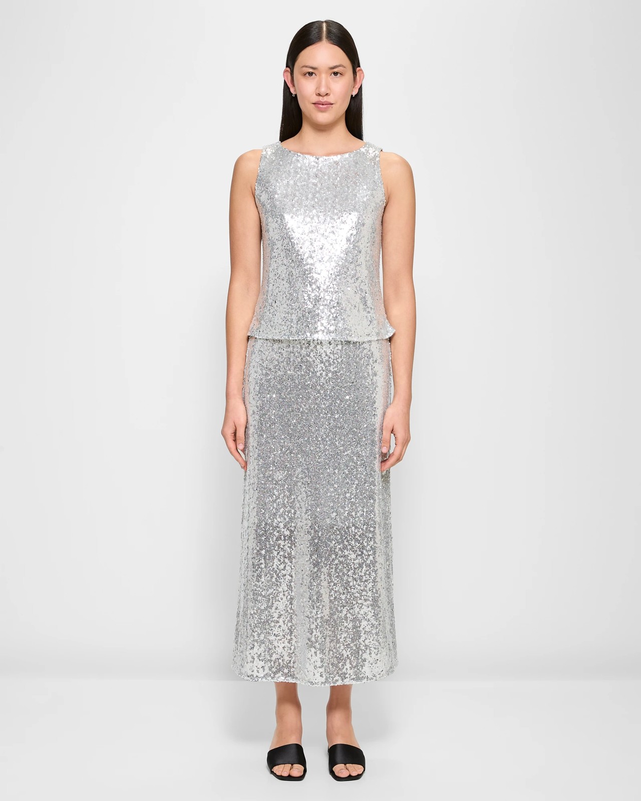 Introducing the Sequin Midi Skirt from Preview. Made from a rich nylon blend with an inner lining, this skirt promises comfort all day long. The shimmering silver sequins add a touch of glamour to any outfit. With its easy pull-on design and a hidden elastic waistband, it ensures a snug fit. The straight design and hem add a sleek edge, making it perfect for any occasion. Make a statement and shine bright wherever you go.