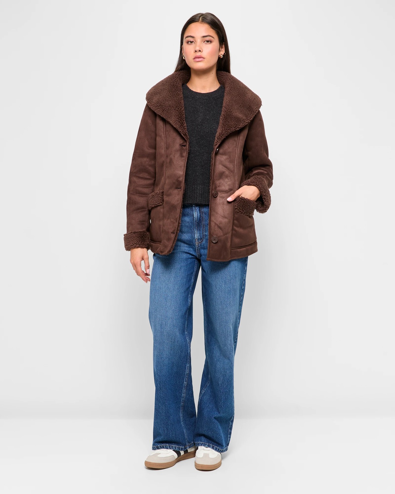 Enjoy the cosy embrace of the Shearling Jacket by Lily Loves. Make heads turn with its sophisticated suede-like exterior and delight in the plush comfort of its teddy-lined interior. The tailored panelling ensures a keen fit, while the large collared neckline and teddy cuffs add a touch of grace. Perfect for everyday wear, this jacket features convenient front pockets and a button-through design for effortless style. Update your wardrobe and experience ultimate comfort and sophistication with this must-have piece.