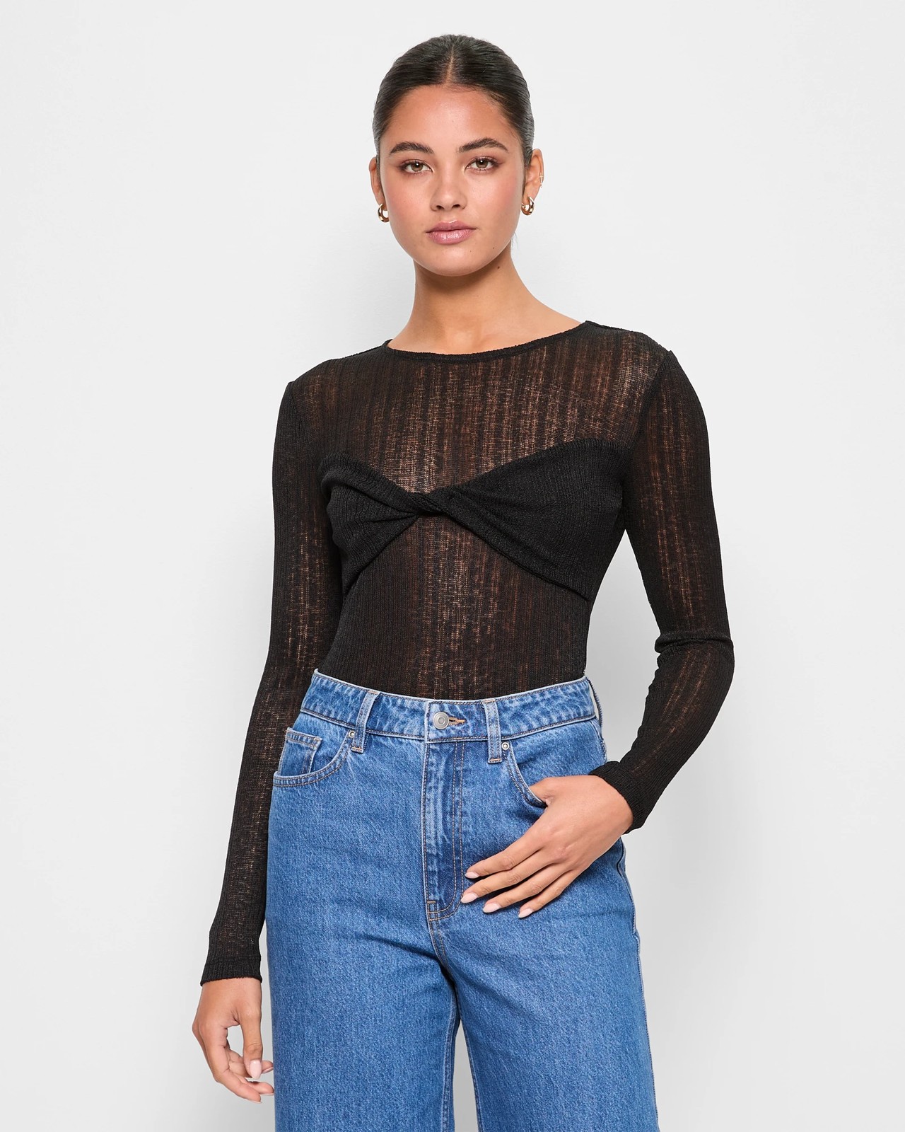 Discover your new favourite top with the Sheer Knit Twist Top from Lily Loves. Made from a cosy polyester fabric, this top features an intricate knit design that feels both light and soft against the skin. Its slim fit and stylish twist detail across the chest offer a look that's both trendy and comfortable, while the rounded neckline and long sleeves ensure it works for any occasion. A curved hemline adds a modern touch, making it perfect for pairing with jeans or a skirt. Add this chic top to your collection and embrace effortless style today.