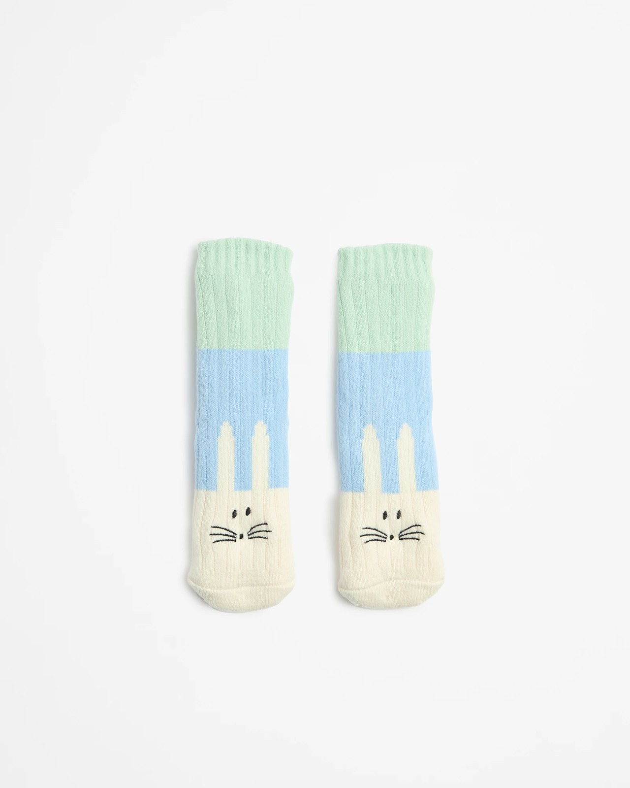 Experience the joy of Easter with these delightful Sherpa Lined Easter Crew Home Socks. Made from stretchy polyester, these socks offer a snug and cosy fit. The sherpa fleece lining ensures your feet are kept warm and toasty, making them perfect for those chilly mornings. Adorned with a charming embroidered bunny face and featuring grip dots on the bottom, these socks are as functional as they are cute. The ribbed top adds to the comfortable crew fit. Treat yourself or a loved one to the ultimate in comfort and festive cheer.
