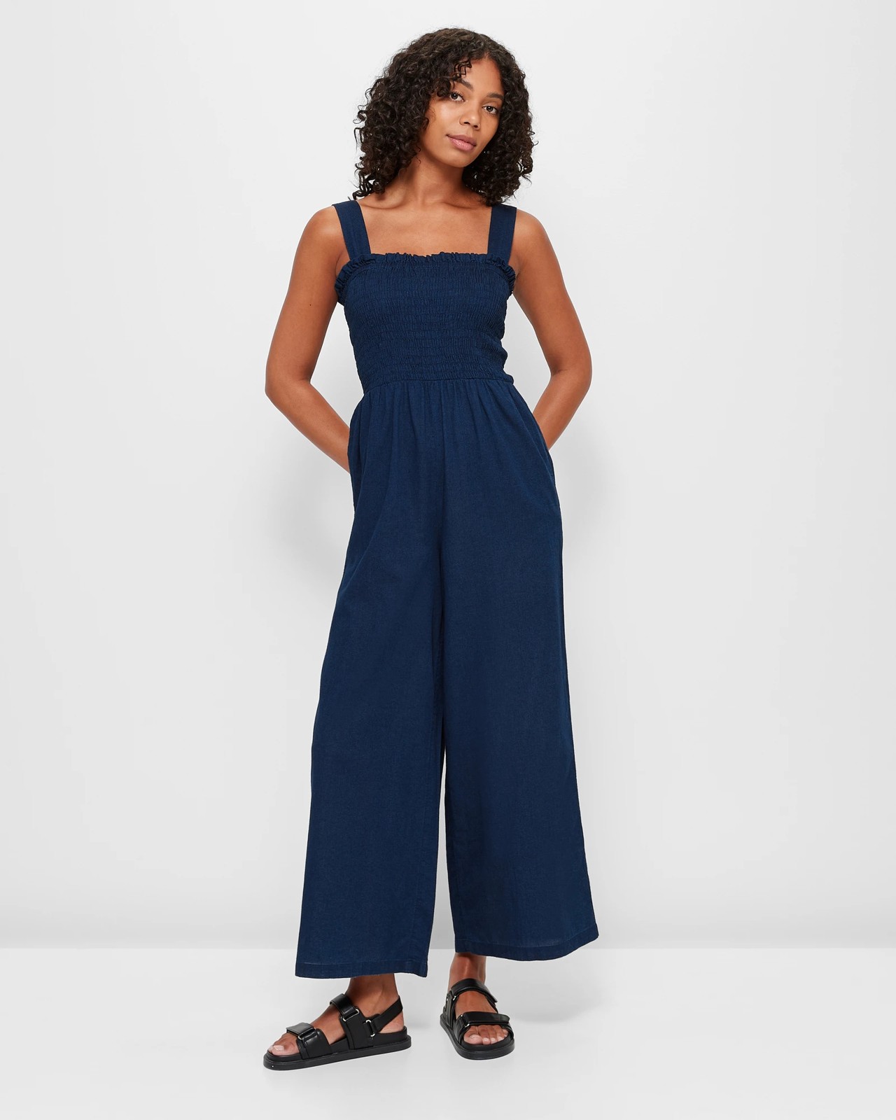 This stylish Shirred Bodice Jumpsuit is perfect for any occasion. Made from a lightweight and breathable cotton fabric, it offers a comfortable fit. The jumpsuit features a square neckline, sleeveless design, and thick shoulder straps for added support. The shirred elastic bodice adds a trendy touch, while the wide leg and ancle-length create a flattering silhouette. With side seam pockets for added convenience, this jumpsuit is both stylish and practical. Whether you're heading to a party or a casual outing, this jumpsuit will make you stand out from the crowd. Get yours today and step up your fashion game!