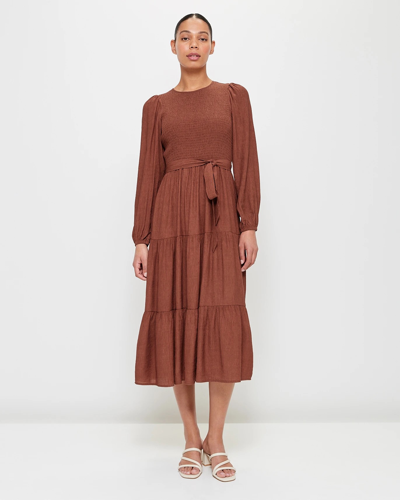 The perfect addition to any wardrobe, the Preview shirred bodice midi dress has a light crinkled fabrication, has a crew neckline, a shirred bodice, long sleeves and a midi length.