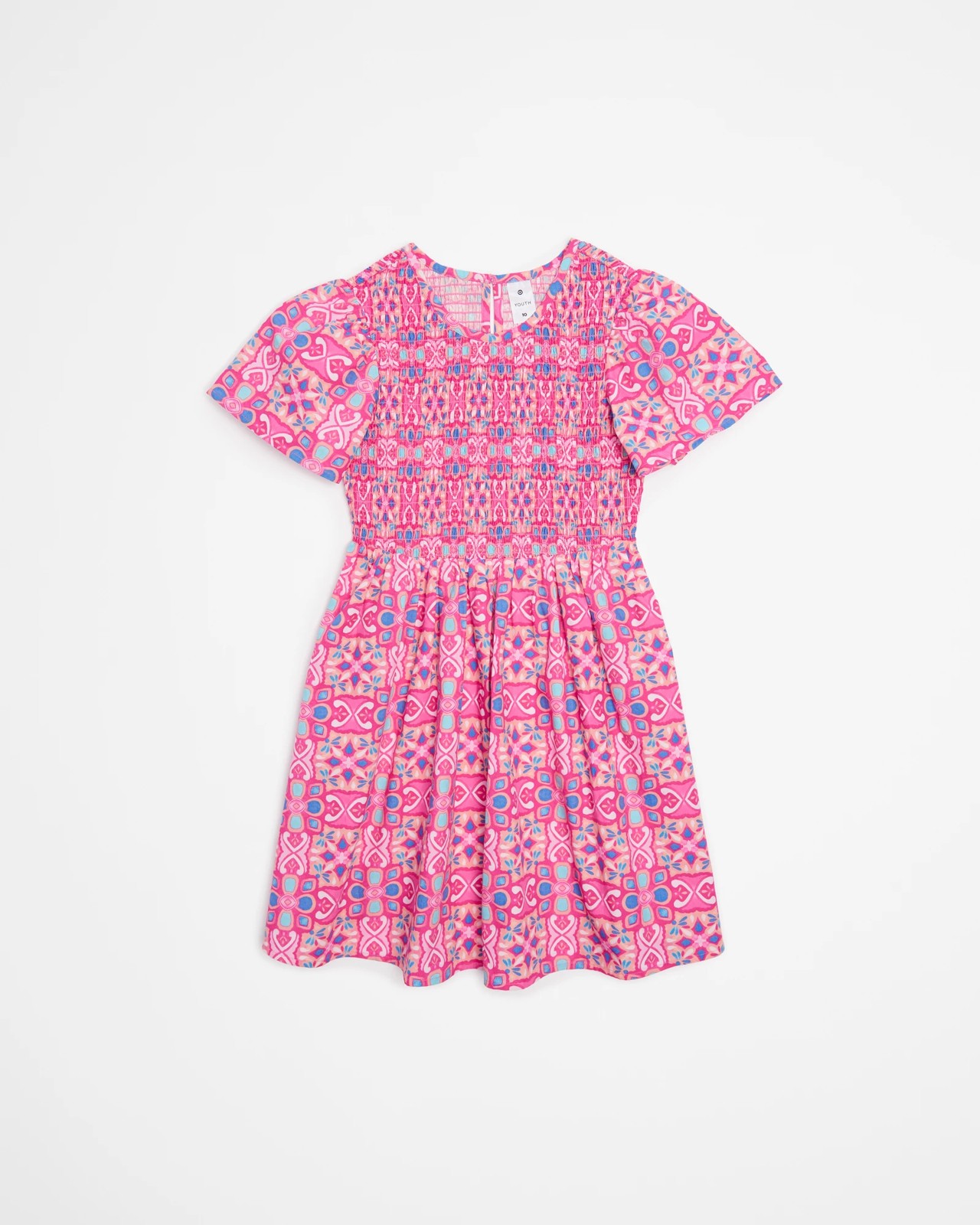 This pretty pink mosaic print Shirred Flutter Sleeve Dress from our exclusive range at is a must-have addition to any girl's wardrobe. Crafted from a cotton rich fabric, this regular fit dress features a shirred elastic bodice for extra comfort and style. The flutter sleeves add an extra feminine touch and the keyhole button at the centre back neck finishes off the look perfectly. Perfect for any special occasion or as part of an everyday outfit, this dress is sure to be a favourite.