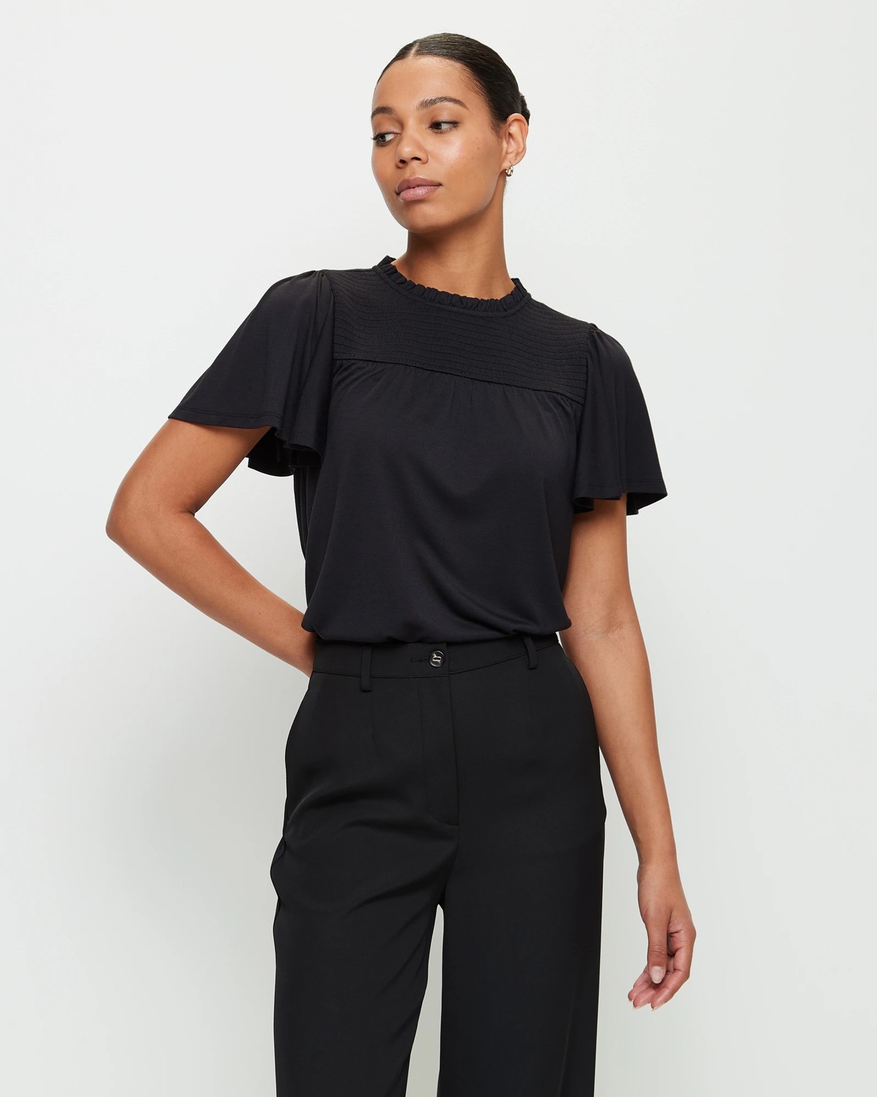Feminine and flowy, the Preview shirred flutter sleeve top will be a must have for woman who love to show their 'girly' side. It features a round neckline with upper frill, a shirred upper chest panel, short flutter sleeves and a curved hemline to flatter your shape.