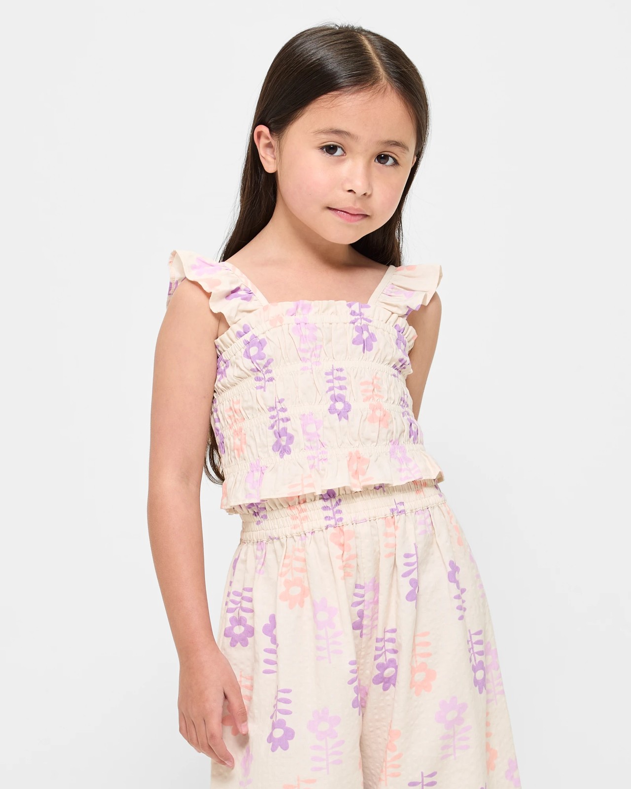 Unveil your little one's charming style with our Shirred Frill Tank. Perfect for warmer days, this top features frilly spaghetti straps and an elastic shirred bodice for a comfortable, snug fit. The slightly cropped design and cream flower print add a touch of whimsy. Pair it with the matching pants, sold separately, for an effortlessly chic ensemble. Don't miss out - bring joy to your child's wardrobe today.