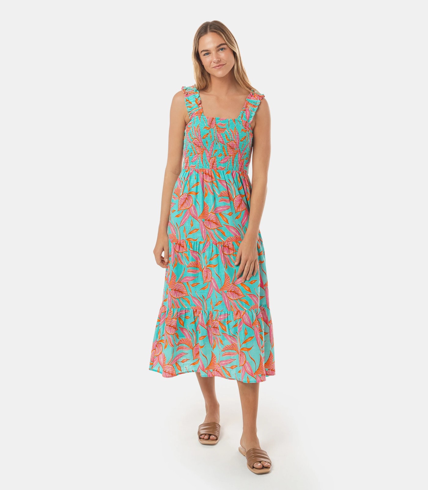 For simple one-step styling, throw on this holiday-ready Piping Hot shirred maxi dress with sneakers or sandals, to suit any occasion. Made with a sophisticated textured cotton for comfort and style.