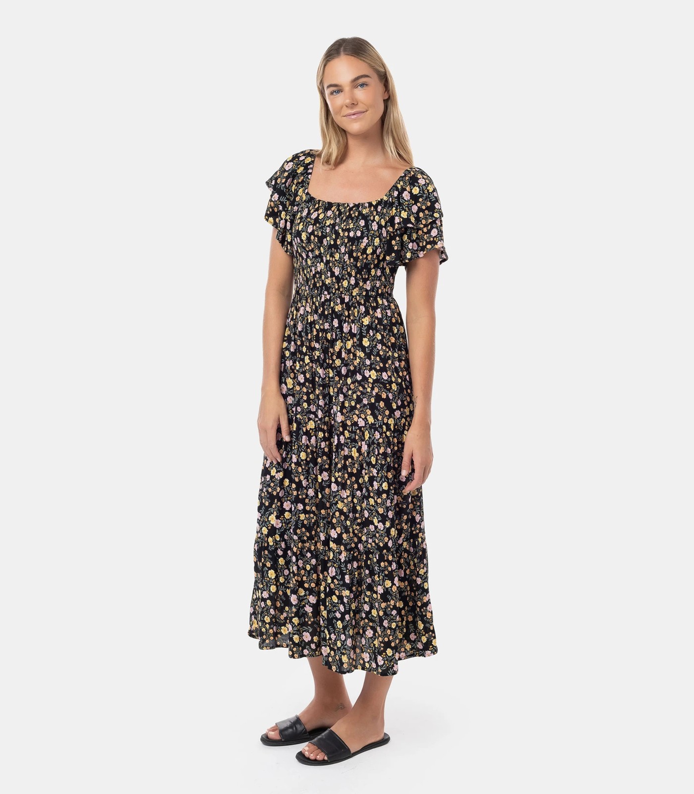 Stay comfortable but set the trend in the sweetest Piping Hot dress. The double ruffle sleeve, flattering shirred bodice and breathable viscose fabrication makes this dress perfect for any occasion. This fabric contains viscose fibres made using wood pulp sourced from responsibly managed forests.