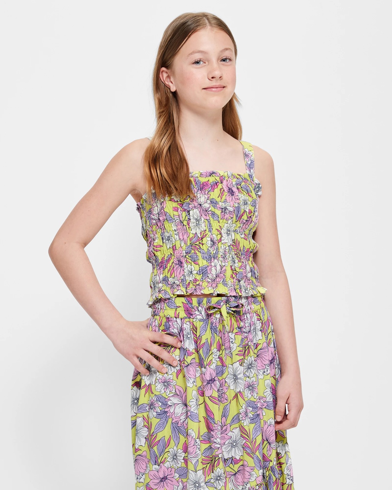 This bright and cheerful Shirred Tropical Singlet is perfect for those hot summer days. Made from a soft cotton fabric, this regular fit singlet features wide shoulder straps, a shirred elastic bodice and a lettuce hem for added definition. With its vibrant yellow tropical prints, this piece will be sure to add a splash of colour to any outfit. Complete the look with shorts or skirts for an effortless summer style.