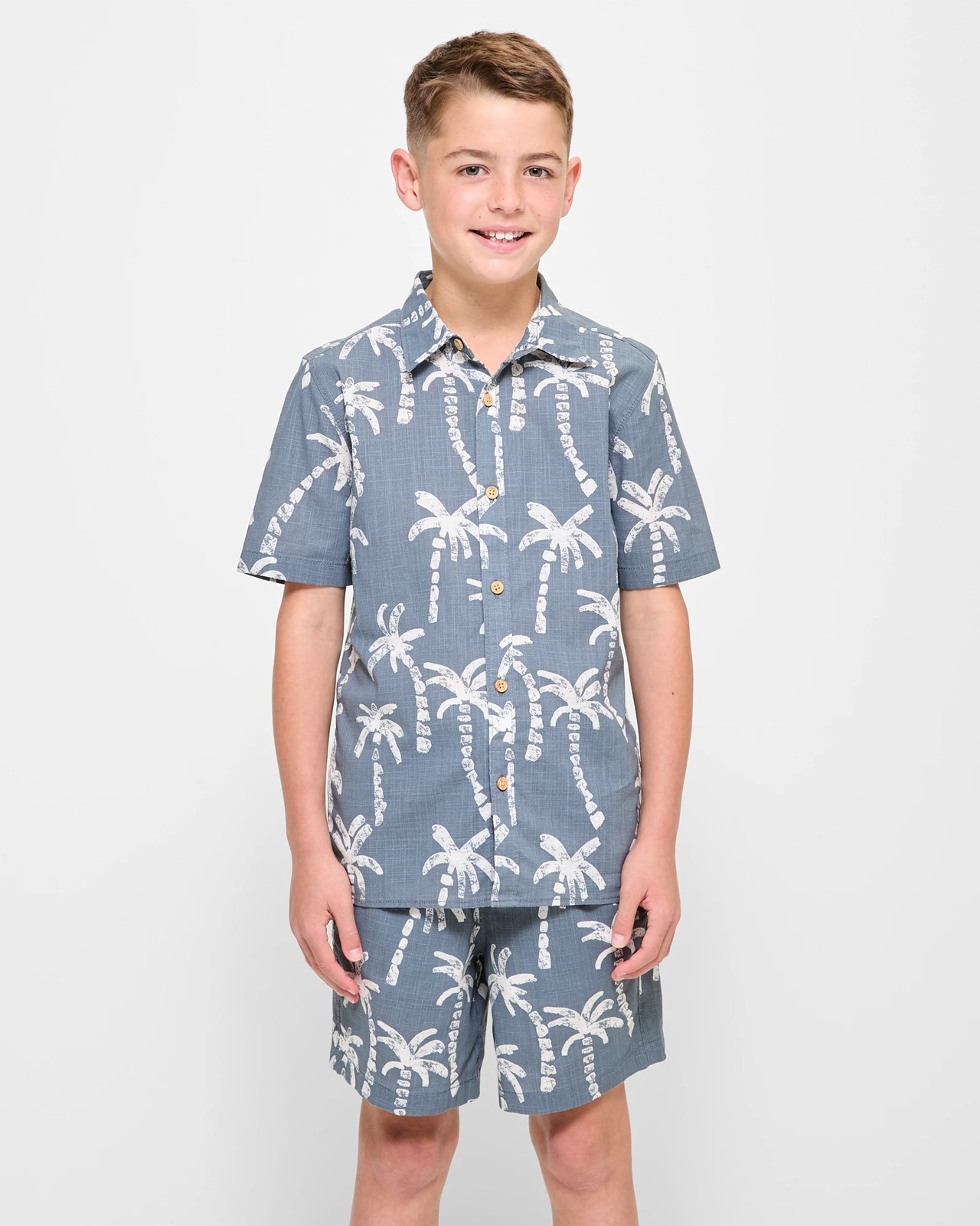 Experience comfort and style with our Shirt and Short 2 Piece Set. Perfect for boys on the go, this set features a charming grey palm print for a fun, casual look. The collared shirt with short sleeves is easy to wear with its button-down front and straight hem. The matching shorts are designed for play with an elastic waistband, drawcord, and convenient pockets. Ideal for both everyday wear and special outings, this set promises style and ease. Don't miss out – upgrade your child's wardrobe today!