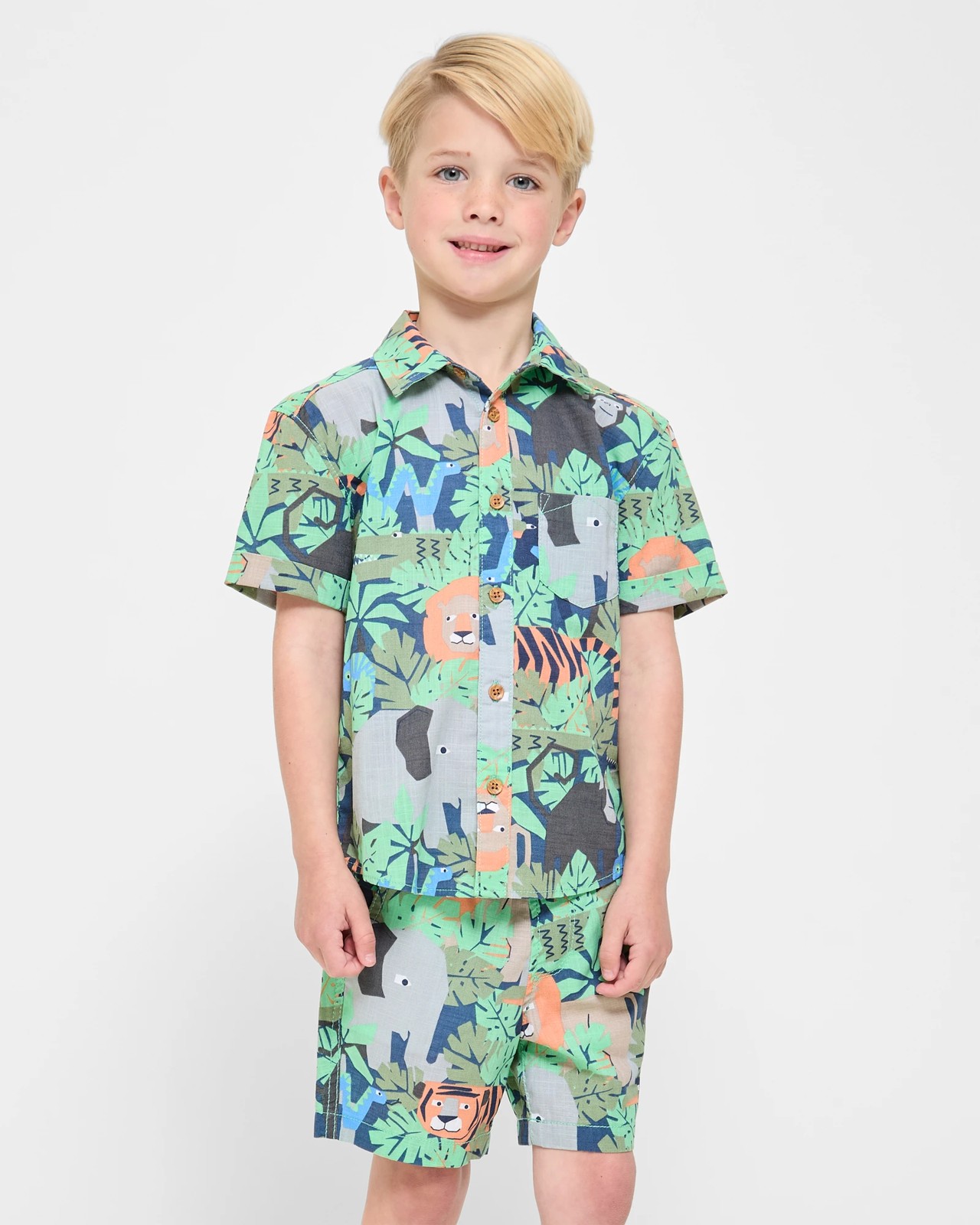 Discover comfort and style with our Shirt and Short 2 Piece Set, perfect for your young explorer. Made from soft cotton, this regular fit set features a beautifully printed shirt with a button-up front, short sleeves, and a handy chest pocket. The matching shorts come with an elastic waistband and drawcord for a superb fit. Let your child play in ease and fashion. Grab this set today for a fun and trendy wardrobe update!