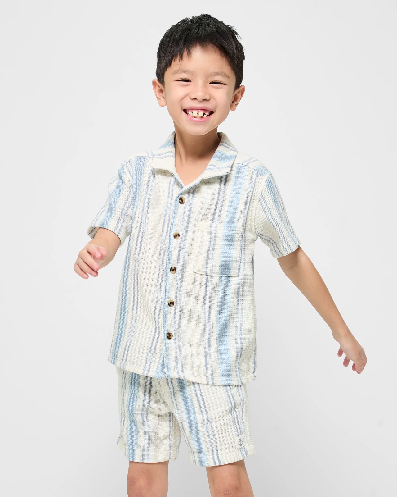 Refresh your child's summer wardrobe with this delightful shirt and shorts two-piece set. The breathable cotton fabric feels gentle against the skin, making it ideal for long, playful days under the sun. The shirt features a subtle blue stripe and a classic collar, finished with smart button fastenings and a handy chest pocket for tiny treasures. The coordinating shorts strike the perfect balance between comfort and style, with a stretchy waistband and handy drawcord to keep them in place, no matter how much running or exploring is on the agenda. Designed for easy outfitting, this set makes busy weekday mornings that bit simpler. Treat your young adventurer to a cool and comfortable look they'll love to wear again and again.