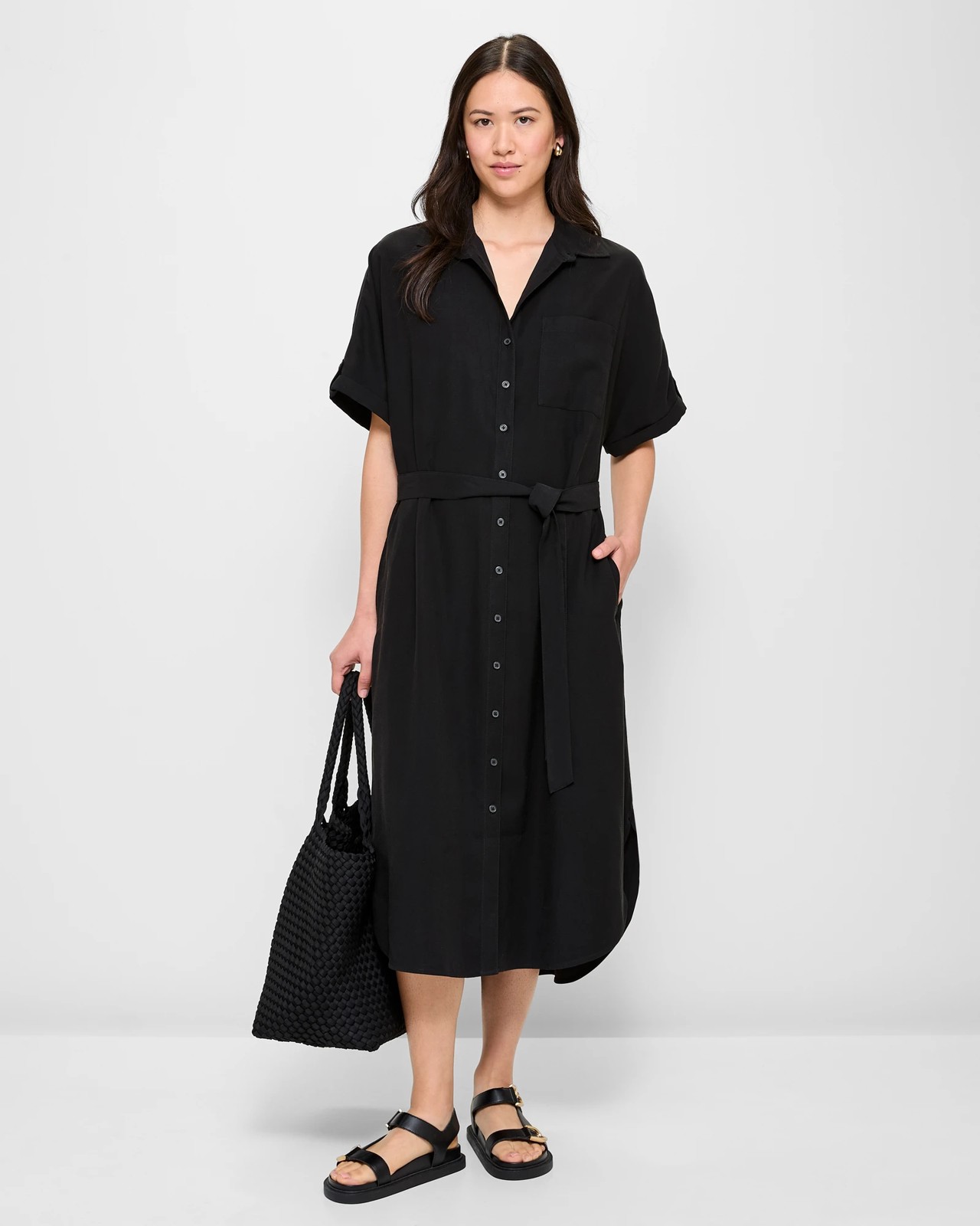 Discover the perfect ensemble of elegance and comfort with our Short Sleeve Button Through Midi Dress. Immerse yourself in the luxurious feel of the viscose/polyester blend and revel in the regular fit that flatters any figure. The classic black hue and round collared neckline exude sophistication, while the practical side seam pockets add a touch of convenience. Elevate your style effortlessly with the removable tie waist belt that accentuates your curves. Whether for a casual day out or a special occasion, stay chic and fashionable with every step in our midi length dress.