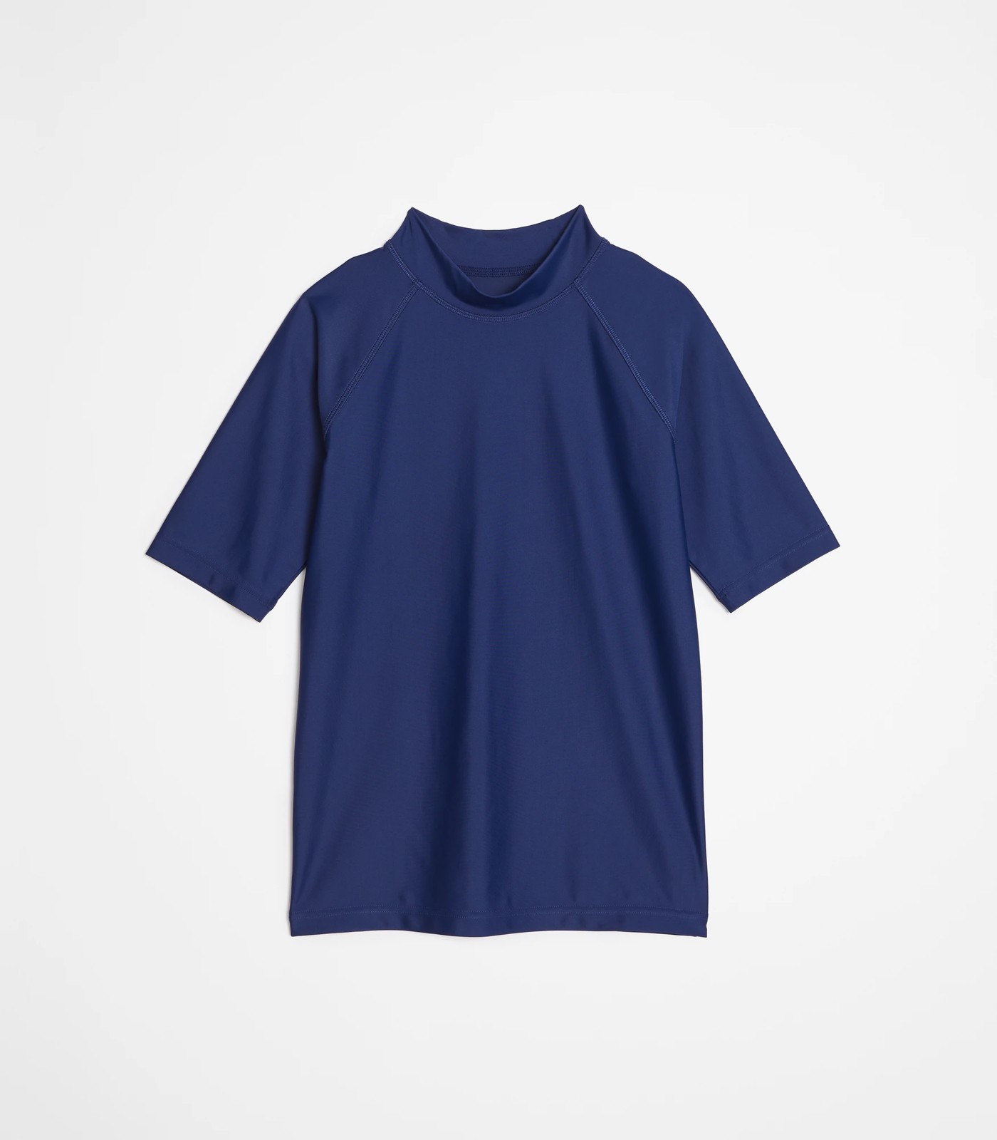 The perfect choice for active kids, the Short Sleeve School Swim Rashie provides UPF 50+ sun protection and is crafted using recycled polyester for a great stretch and regular fit. This navy blue rashie features a stand collar, short raglan sleeves that allow for full range of movement in the water, and a straight hem. It's unlined with an inner name tag for added convenience.