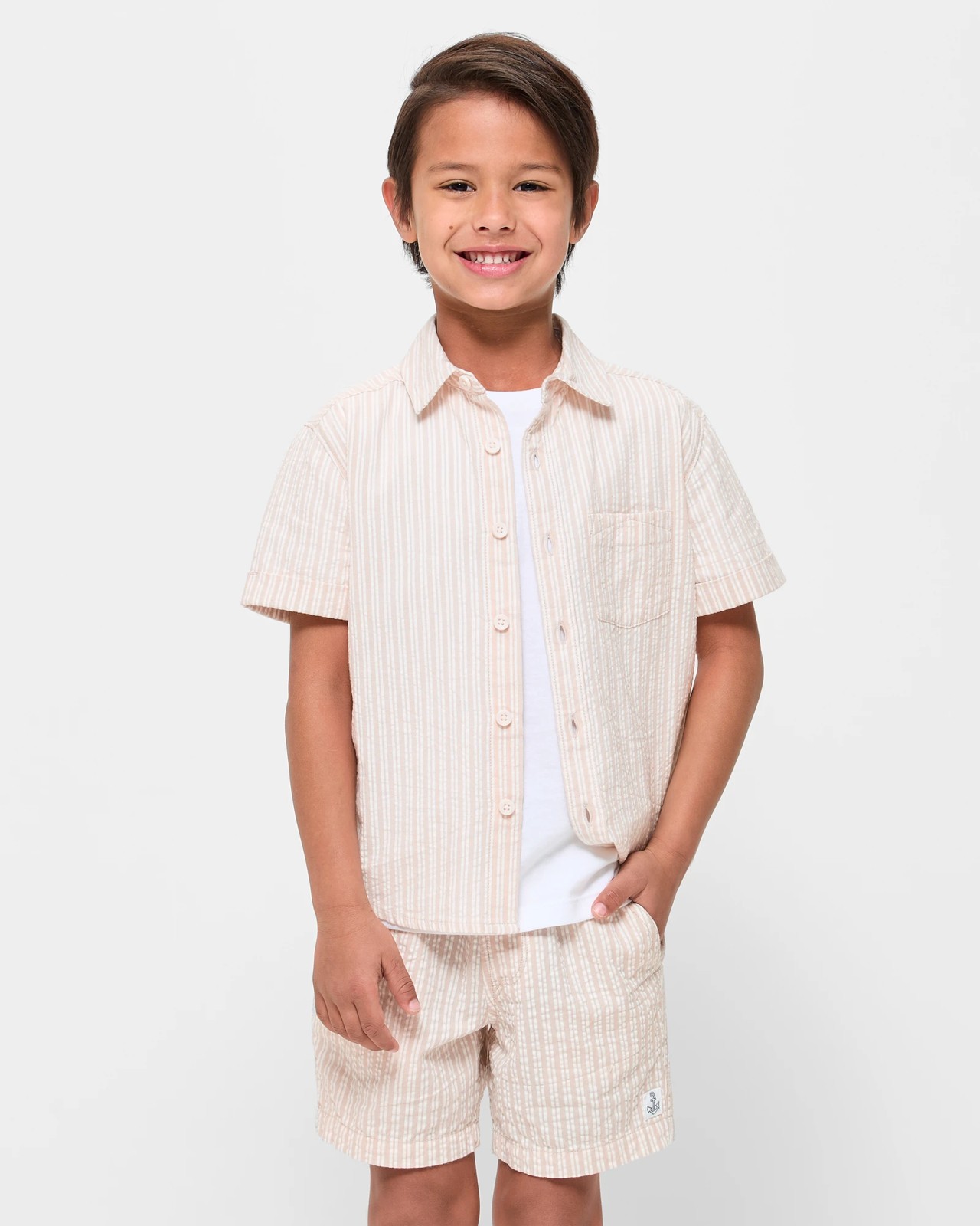 Elevate your young gentleman's wardrobe with this charming Short Sleeve Textured Shirt. Made from a soft seersucker fabric, it offers a comfortable regular fit perfect for any occasion. The collared design and button-down front provide a smart look, while the curved hem and chest pocket add a touch worthy for both playground antics and family gatherings. Pair it with matching shorts sold separately for a coordinated ensemble that stands out. Transform every outing into a stylish adventure!