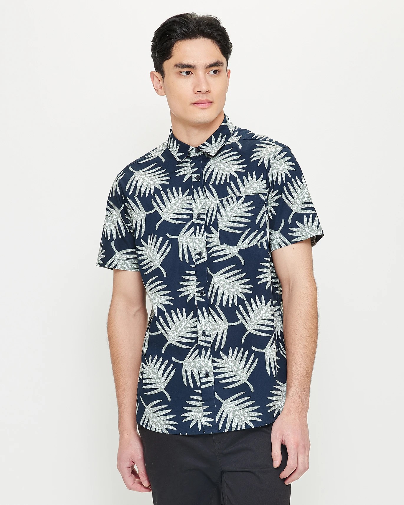 This navy blue short sleeve cotton shirt will be your go-to summer essential! The classic button down front and collared neckline make for a timeless look, while the palm tree print adds a fun twist. It also features a single chest pocket, back centre pleat and curved hemline for added style. Whether you’re headed to the beach or out on the town, this shirt will keep you cool and comfortable all day long!