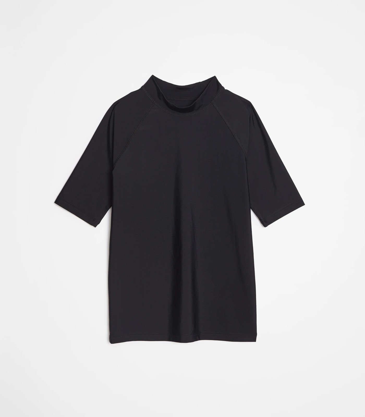 The perfect choice for active kids, the Short Sleeve School Swim Rashie provides UPF 50+ sun protection and is crafted using recycled polyester for a great stretch and regular fit. This black rashie features a stand collar, short raglan sleeves that allow for full range of movement in the water, and a straight hem. It's unlined with an inner name tag for added convenience.