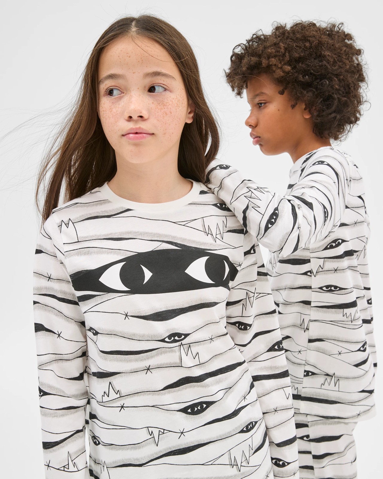 Bring some spooky fun to bedtime with this unisex Mummy Halloween sleep set, designed especially for older kids. Made from soft Australian cotton for exceptional comfort, this two-piece pyjama set features playful mummy character prints across the top and bottoms, making every bedtime an adventure. The regular fit allows for easy movement, while the crew neck, long sleeves, and elastic waistband keep things snug and cosy through the night. With matching trousers and a straight hem, this set is perfect for sleepovers or family movie nights. Plus, you can collect the matching sibling sets to create unforgettable moments together. Treat your child to comfort and laughter this Halloween – order your set today!