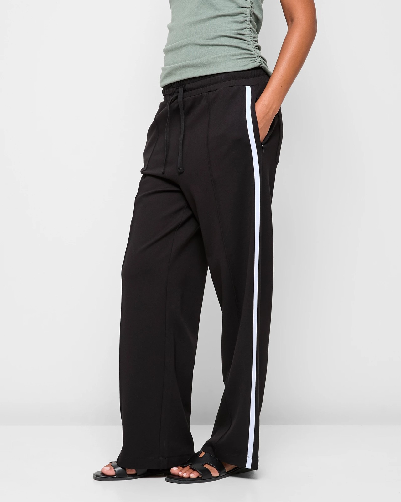 Step up your casual wear game with these Side Stripe Jogger Pants for women. Made from a comfortable blend of viscose and nylon with just the right amount of stretch elastane, these joggers are designed to move with you. The sleek black fabric is complemented by stylish white stripes down the sides, adding a trendy twist to your everyday look. Featuring a mid-rise waist and a thick elastic waistband with a drawstring, these pants ensure both comfort and style. Perfect for staying relaxed yet chic, grab a pair today and enhance your loungewear wardrobe.