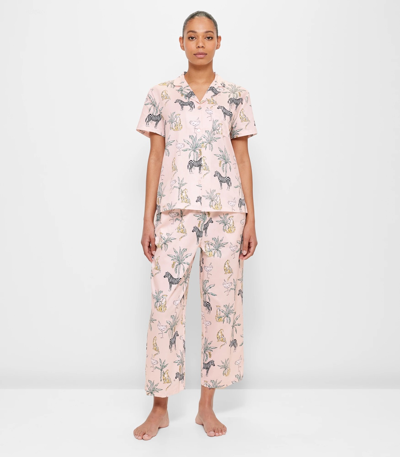 A great coverup when heading to bed, the cotton sateen pyjama set features a shirt with a button through front for easy pull on and cropped length pants with an elastic waistband for comfort.