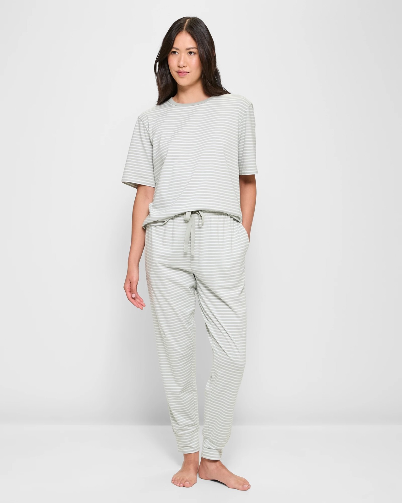 Relax in style with our Sleep Jogger Pants. Designed for ultimate comfort, these joggers are crafted from a cotton-rich fabric with added stretch, ensuring a soft and lightweight feel. The stripe pattern adds a touch of elegance to your loungewear collection. Featuring a classic jogger design, they come with a thick elastic waistband and drawstring for a custom fit. With side seam pockets and cuffed hems, these pants combine practicality with trendy style. Treat yourself to a pair today!