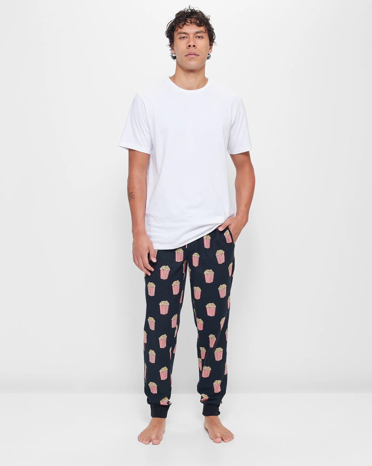 Experience Comfort with Sleep Pants – Maxx. Discover incredible comfort and style with our Maxx Sleep Pants. Made from cotton, these pants ensure a restful night's sleep. The regular fit and elastic waistband with drawstrings provide the perfect balance between snug and loose, giving you the freedom to move effortlessly. Featuring a playful popcorn print on a sleek black background, you're bound to look stylish even in your sleep. Complete with side pockets and a mock fly front with buttons, these sleep pants are as practical as they are comfortable. Don't miss out – embrace relaxation with Maxx Sleep Pants today!