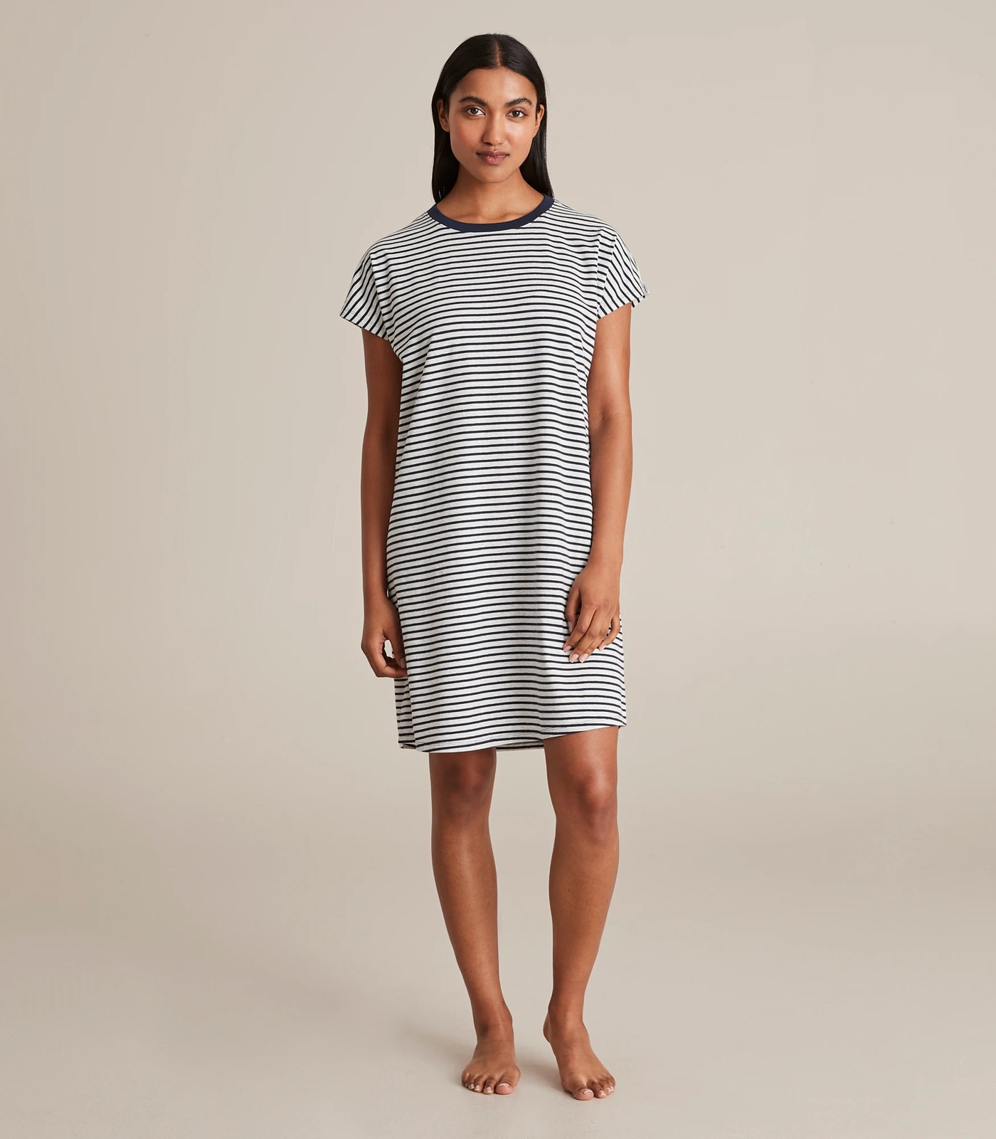 For a lightweight night's sleep with ease of movement, the sleep t-shirt nightie features a crew neckline, short sleeves, a breathable cotton fabrication and a midi length.