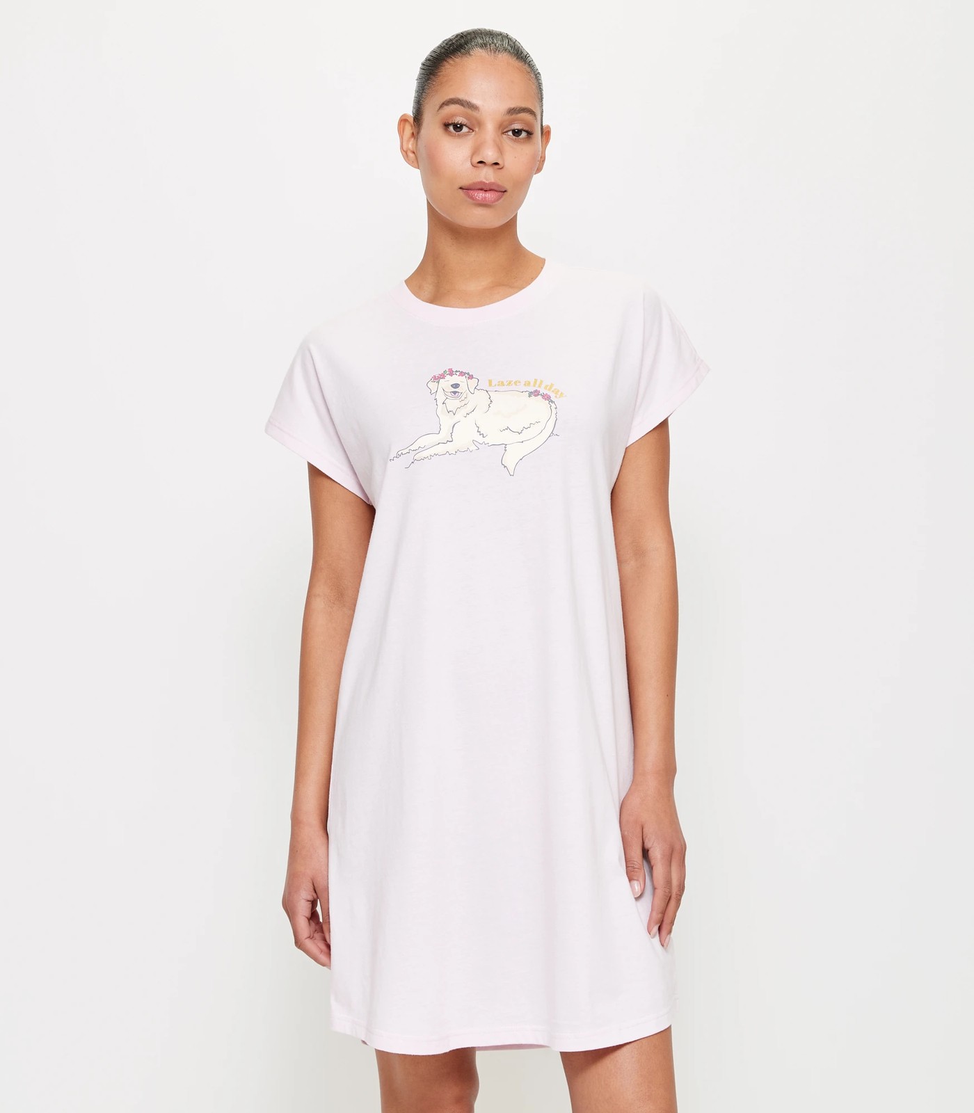 Stay comfy and stylish while you rest with our Sleep T-Shirt Nightie. This sleep top is made from a breathable cotton fabrication that stretches for comfort. The pink t-shirt features a cute dog print to the chest with the wording "LAZE ALL DAY" for a fun and friendly touch. Finished with a crew neckline, short sleeves and a straight hemline, you'll never want to take it off!