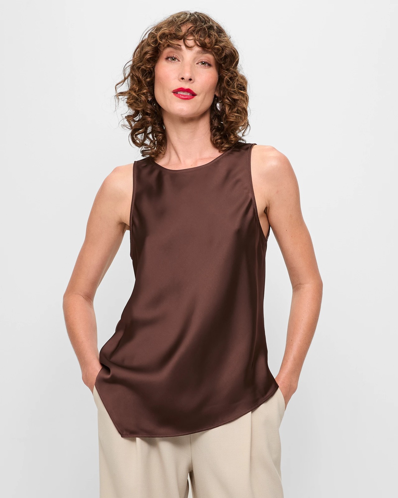 Step out in style with our Sleeveless Asymmetrical Hem Top. Made from quality polyester with a smooth satin feel, this top offers both comfort and charm. The rich chocolate brown colour paired with its unusual asymmetrical hemline makes it a versatile option for any occasion, whether it’s a night out or a casual day. The rounded neckline and back button closure with keyhole detail add just the right amount of sophistication. Model wears a size 8. Add this chic piece to your wardrobe and turn heads wherever you go.