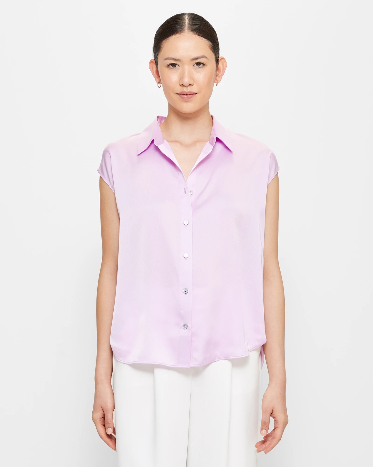 A stylish summer staple, this Preview shirt is the perfect addition to your wardrobe. Made from a soft polyester fabrication, it has a satin material that will keep you cool and comfortable in warm weather. The regular fit and round collared neckline provide a flattering silhouette, while the button-through front gives it a timeless touch. With a curved high-low hemline and gathering around the back of the collar, this sleeveless shirt is sure to become your go-to piece for everyday wear.