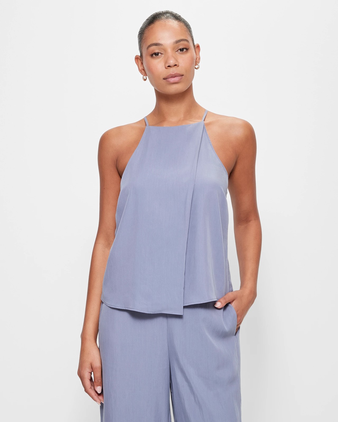 Discover the ultimate in comfort and effortless style with our Sleeveless Halter Cami. Its modal/polyester blend ensures a super-soft touch, while the square neckline and halter straps provide a secure fit. The sleeveless design and darting at the chest add a touch of sophistication. The wrap-over front and flowy silhouette make it perfect for any occasion, and the curved hemline adds a modern twist. Easy to wear with a button closure and keyhole detail at the back, this cami is a versatile addition to your wardrobe.