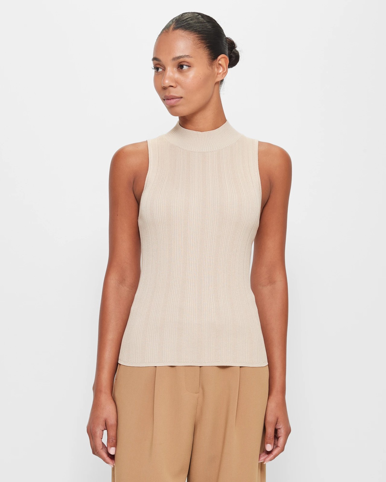 Introducing our Sleeveless Mock Neck Variegated Knit Top from Preview. Made from a luxurious blend of viscose and nylon, this top is not only stylish but also eco-friendly, containing LENZING ECOVERO branded viscose fibres. The all-over ribbed knit design adds texture and dimension to the piece, while the slim fit flatters your figure. The round mock funnel neckline and sleeveless design give it a modern and chic look. The straight thin ribbed hemline adds a polished finish. Perfect for both casual and formal occasions, this top is a versatile addition to your wardrobe. Step up your style game with our Sleeveless Mock Neck Variegated Knit Top from Preview today!
