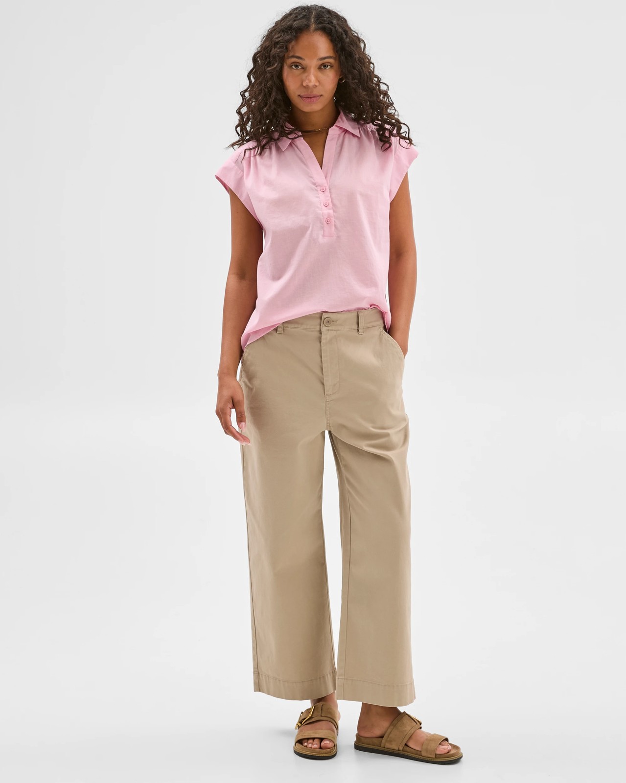 Step into everyday comfort with this sleeveless popover collared shirt, designed for both ease and style. The soft cotton fabric lets you stay cool and relaxed throughout your day, while the sleeveless cut and airy feel make it just right for warmer weather or layering under a light jacket. Its gently curved hem and gathered details across the shoulders add a graceful touch, while the smart collar and button-down front keep things looking sharp. This shirt is perfect for dressing up or going casual, making it a great addition to any wardrobe.