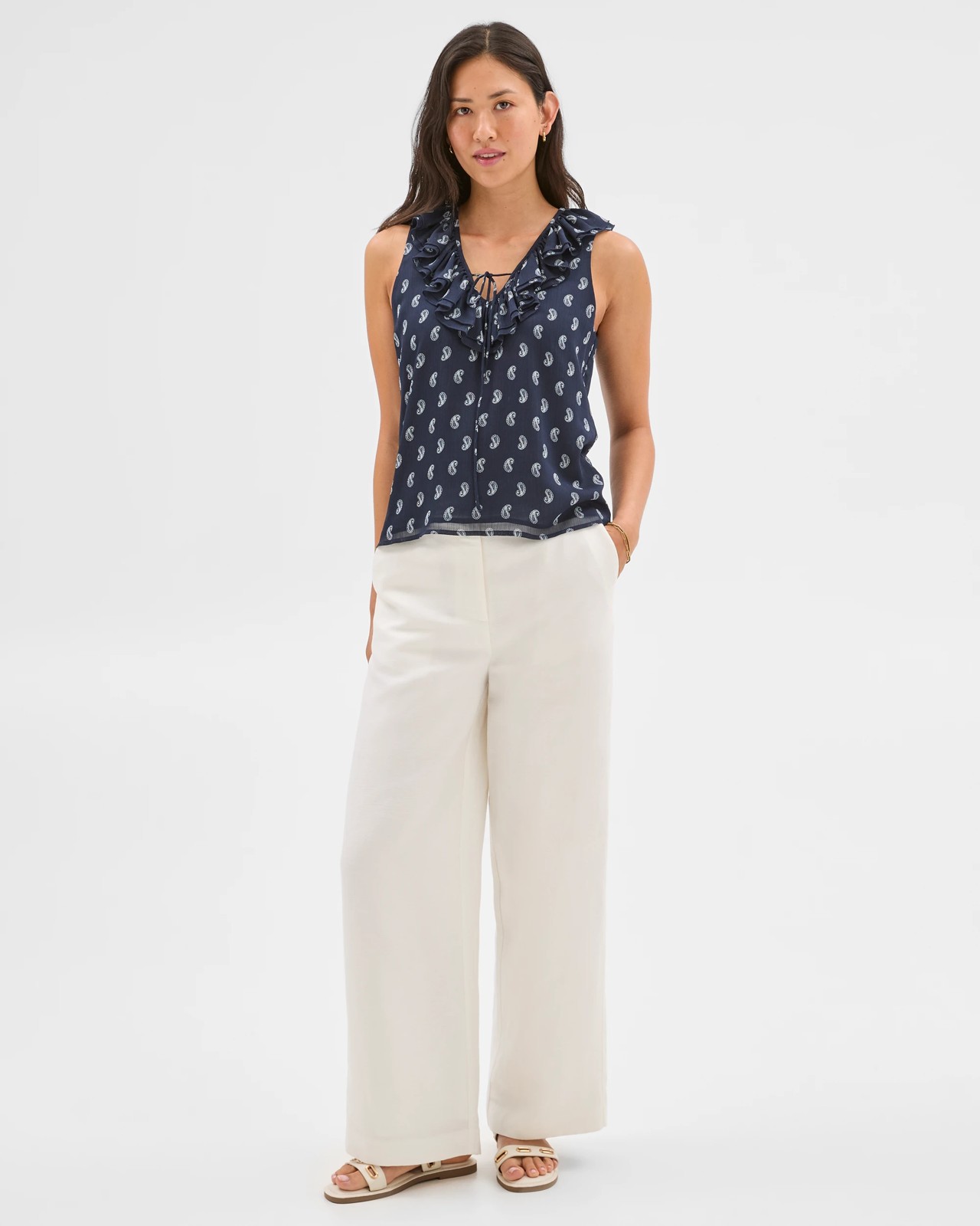 Bring a sense of easy charm to your wardrobe with this Sleeveless Ruffle Blouse. The floaty, lightweight material feels wonderful against your skin, while the playful double-layered frills at the neckline make every outfit a little more special. Its comfortable fit and high-low hemline ensure you can enjoy freedom of movement wherever your day takes you. Wear it with statement jewellery for a dinner out, or style it casually for weekend adventures with friends. Discover a top that effortlessly adapts to your style and brightens up your every day.