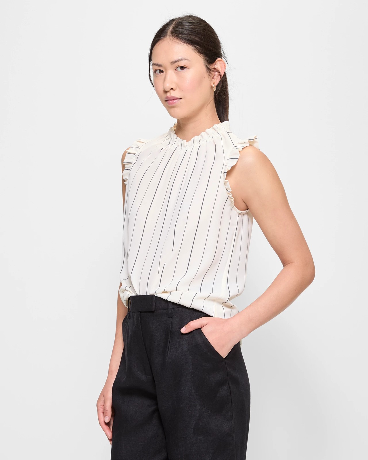 Experience the charm and comfort with our Sleeveless Ruffle Neck Tank Top by Preview. This stylish top features a round neckline adorned with delightful frills, adding a touch a feminine flair to your wardrobe. Its sleeveless design and curved hemline ensure you stay cool and comfortable, while the back button closure with keyhole offers a classic touch. Perfect for both casual outings and more dressed-up occasions, this top is a must-have addition to your collection. Don't miss out on this versatile piece!