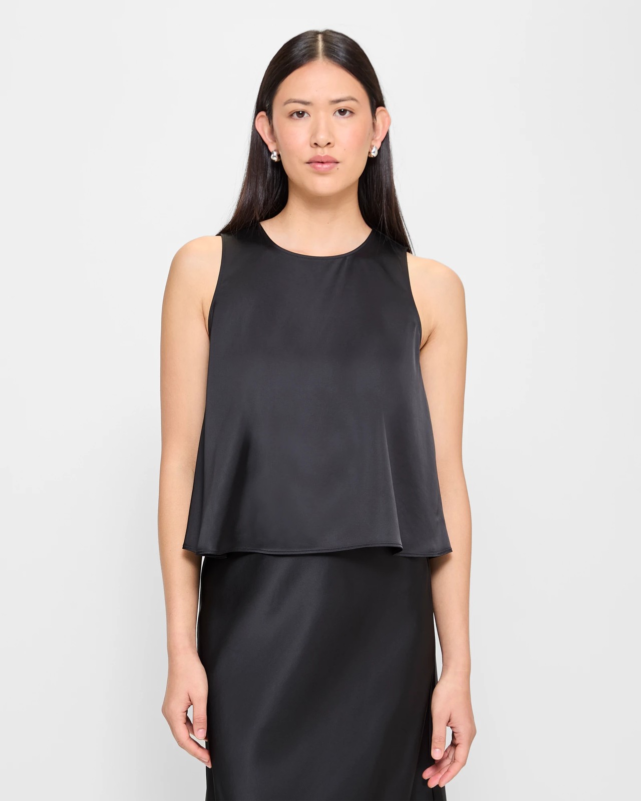 Introducing our Sleeveless Satin Shell Top by Preview. Crafted from a luxurious and stretchy polyester blend, with a hint of recycled materials. The satin finish adds elegance to your look, while the A-line cut and curved hemline create a flattering silhouette. Complete with a round neckline and a convenient back button closure. Elevate your wardrobe with comfort and style. Try the preview shell top today!