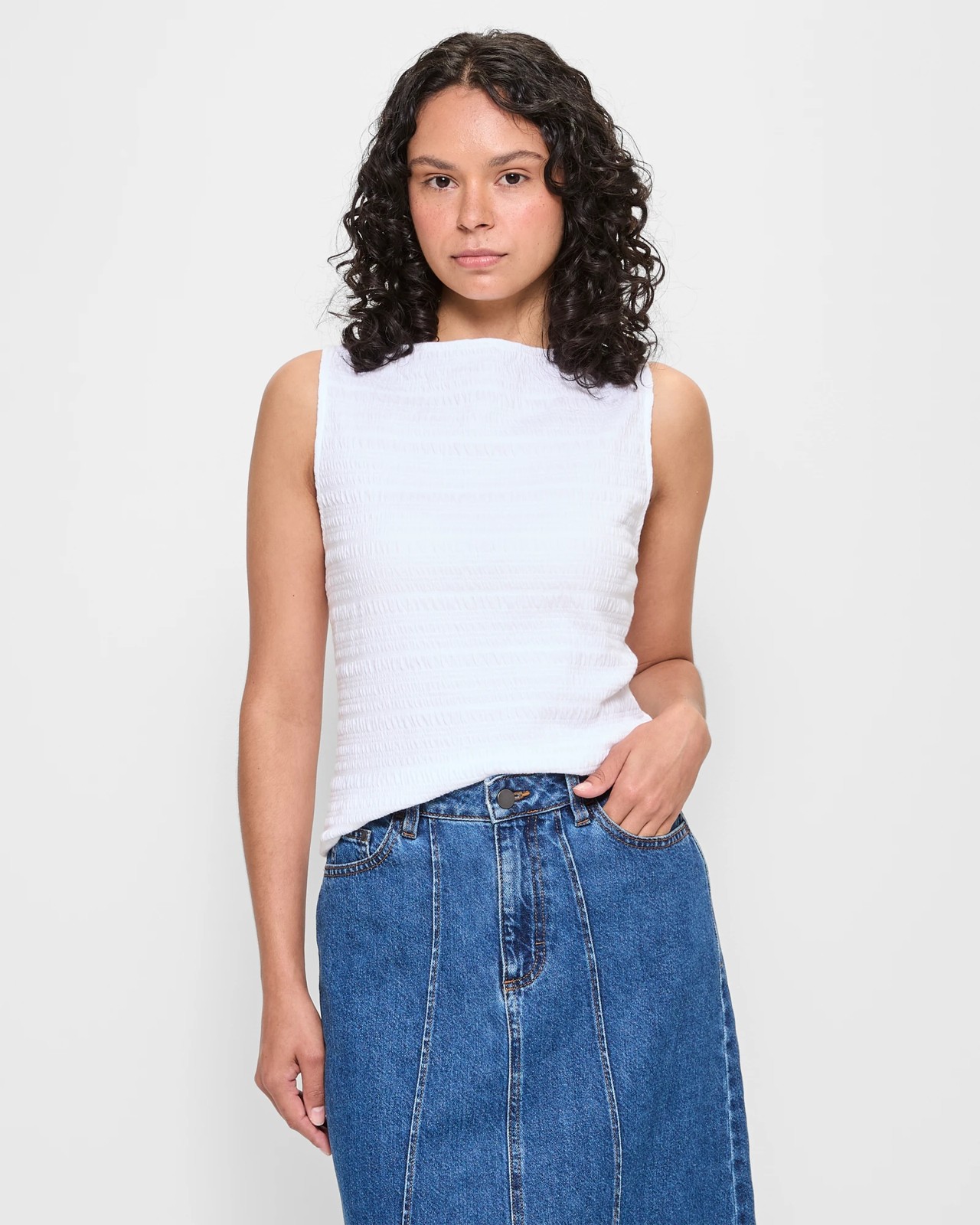 Discover ultimate ease with our Sleeveless Textured Boat Neck Tank Top. Made from a soft cotton and polyester blend, this top brings together comfort and style with its unique textured fabric. The boat neckline and sleeveless design offer a streamlined look, while the stretch elastane ensures freedom of movement. Perfect for both laid-back and formal settings, this top is set to become a favourite in your wardrobe. Make it yours today!