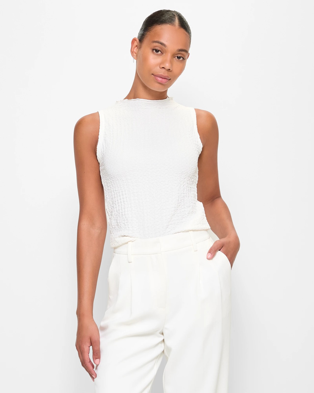 Discover the charm of our Sleeveless Textured Mock Neck Tank Top. This top is made from a luxurious polyester blend that offers remarkable comfort with the added flexibility of elastane. Its unique textured fabric stands out, while the cloud dancer hue provides a fresh, appealing look. The round mock high neckline with delicate lettuce trim adds a touch of sophistication, perfect for any occasion. With its versatile sleeveless design and straight hemline, this top is your new go-to for a seamless style. Ready to refresh your wardrobe? Try it on and experience unparalleled comfort and style.