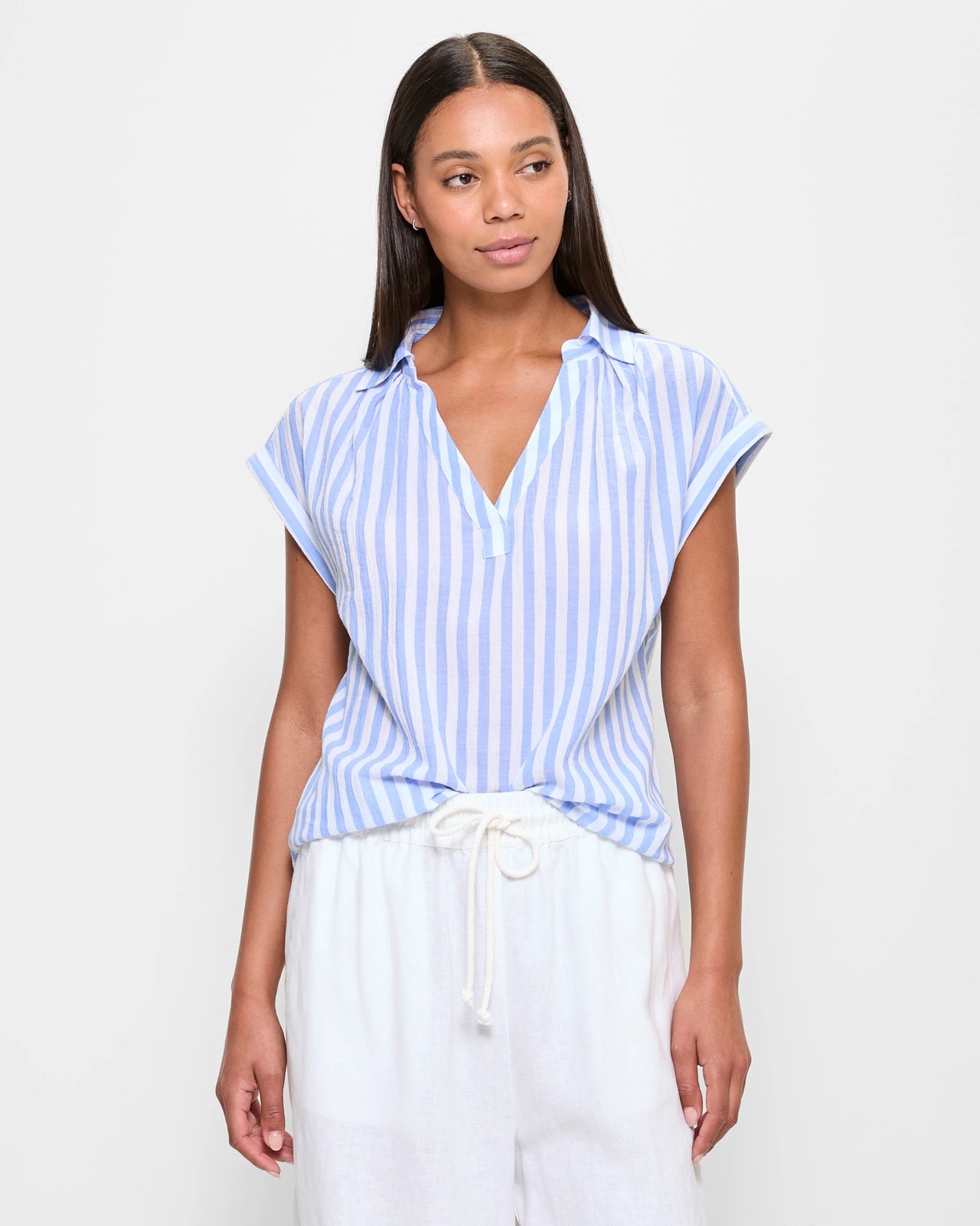 Discover the perfect mix of ease and style with our Sleeveless V-Neck Collared Shirt. Designed from breathable cotton, it ensures all-day comfort. The v-drop neckline with delicate gathering around the collar adds a refined touch, while its sleeveless design and cuffed armholes offer unrestricted movement. With a curved hemline and back centre pleating for added flexibility, this shirt is a versatile addition to any wardrobe. Make it your go-to choice for a chic and relaxed look.