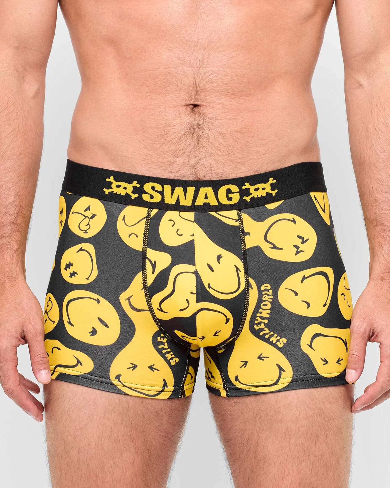 Add a splash of fun to your wardrobe with the Smiley World Trunks - Swag. Made from a blend of micropolyester and spandex, these trunks ensure an ultra-soft and comfortable fit throughout the day. The bright, all-over smiley design spreads joy, while the silky waistband provides extra comfort. Enjoy a secure fit with the contoured pouch and short leg length, making these trunks ideal for everyday wear. Perfect for adding a touch of joy to your undergarment collection!