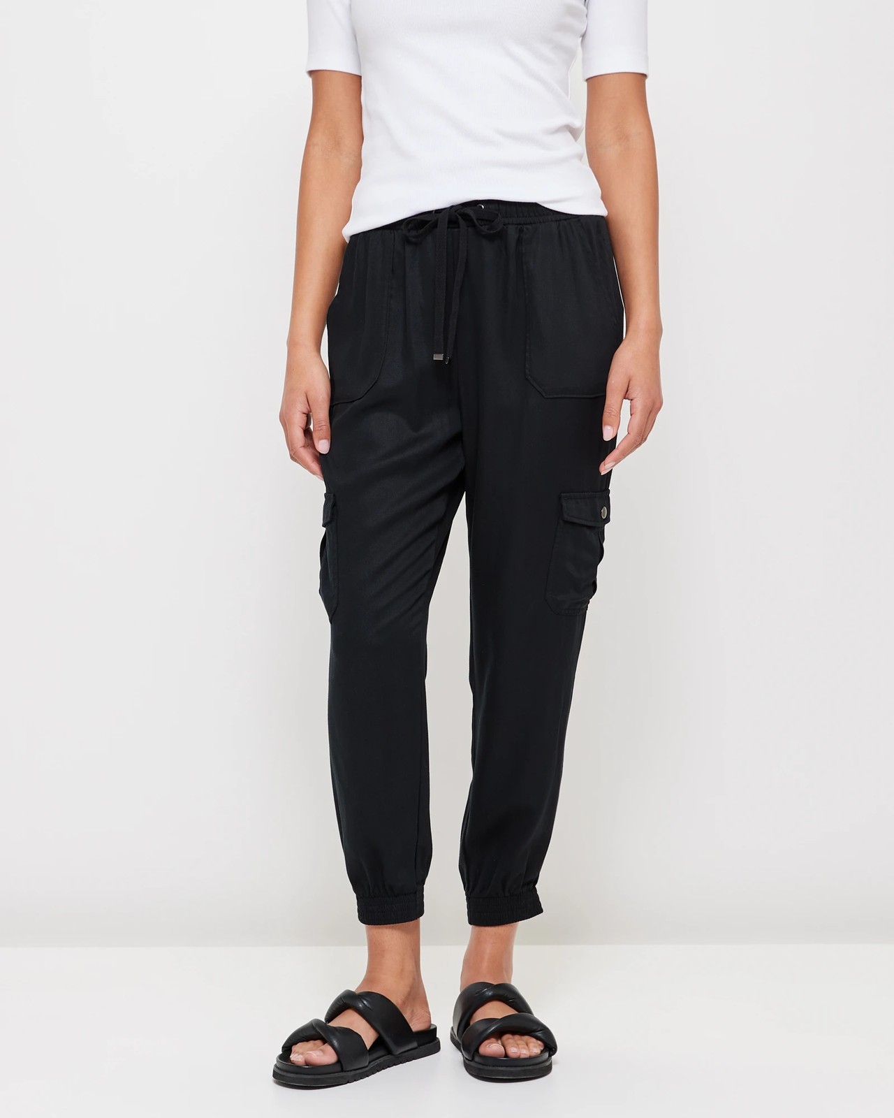 Stay comfortable in style with our Soft Cargo Jogger Pants. Crafted from a soft lyocell fabrication, this pair features a regular fit and black colour for an effortless look. It also includes an elastic waistband with drawstring for a secure fit, side seam pockets and exposed side seam cargo pockets with fold over top and metal snap closure. Further, it has mock back pockets and thick elastic cuffs to complete the look. Perfect for any casual occasion!