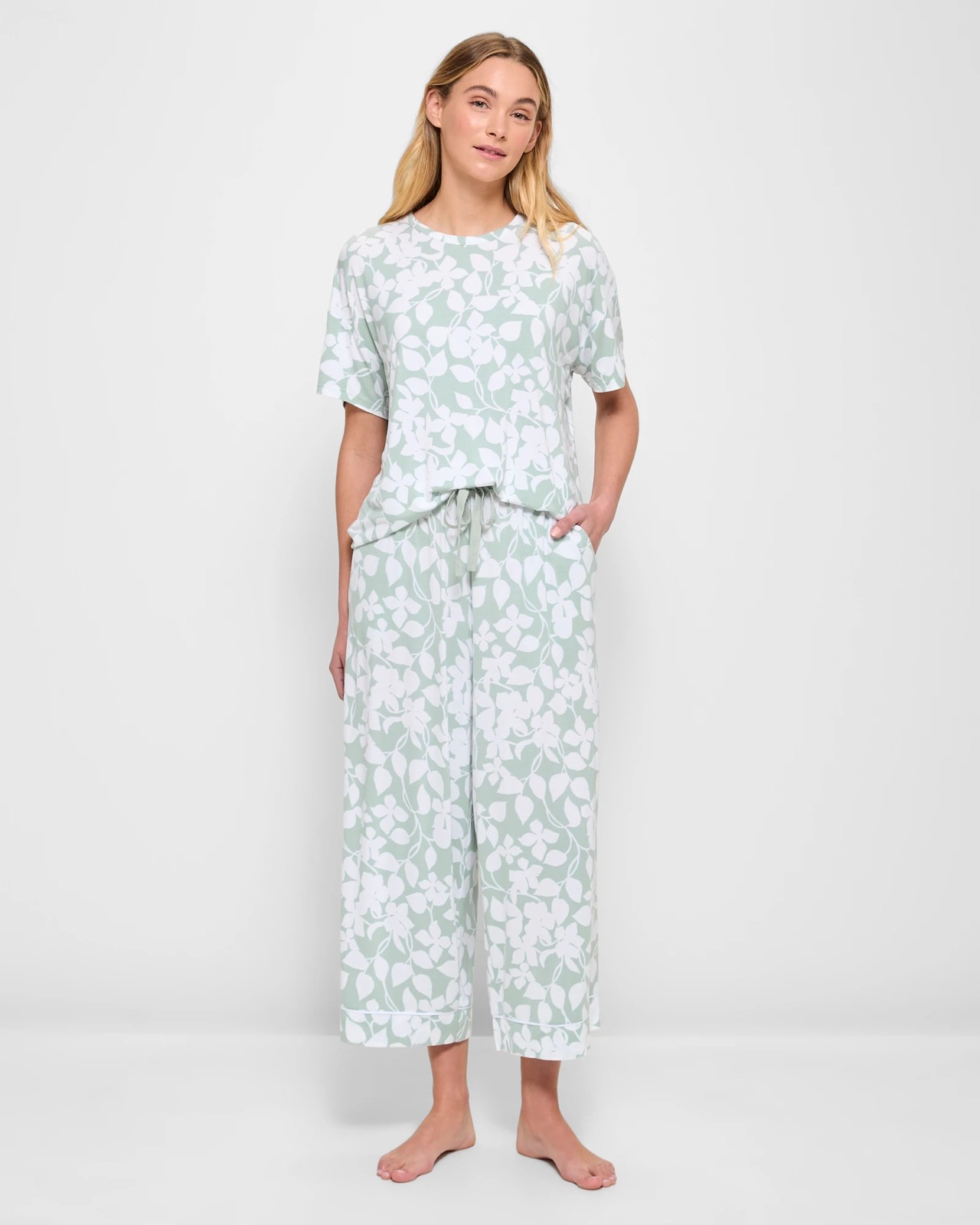 Indulge in pure comfort with our Bamboo Pyjama Culotte Pants. Feel the luxurious touch of bamboo-derived fabric. The regular fit combined with the elastic waistband and drawstring provide ease of wear. Adorned with a charming floral print, these culottes feature side pockets for convenience. The relaxed cut leg and cropped length add a trendy touch, finished off with a stylish cuffed hemline. Experience unmatched softness and style, and complete the set with the matching pyjama top (sold separately). Treat yourself to the ultimate relaxation experience!